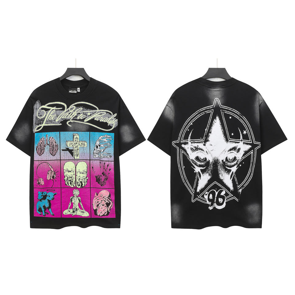 T-shirt tendance avec motif psychédélique à neuf grilles et design occulte, 250g