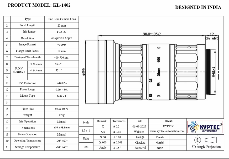 Objectif de numérisation linéaire 25 mm haute résolution compatible 8K 4K pour systèmes d'automatisation et d'inspection industriels
