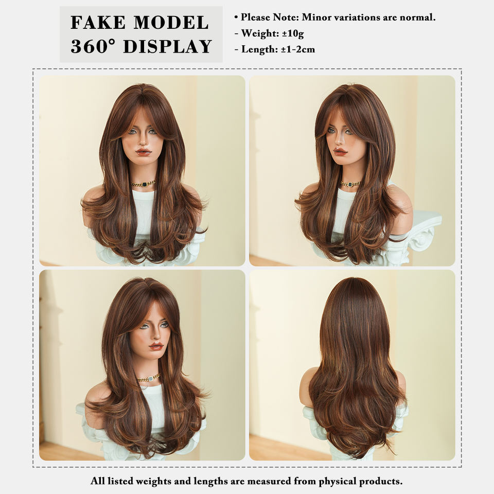 Perruques synthétiques mi-longues de 26 pouces, marron châtain avec mèches blond caramel, en fibre résistante à la chaleur, effet mat naturel, Peluca
