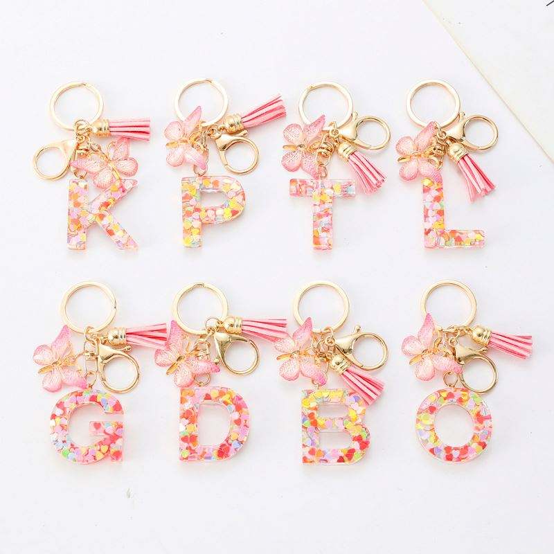 Porte-clés initial en résine 26 lettres avec pendentif papillon et pompon, accessoire élégant pour sac à main femme