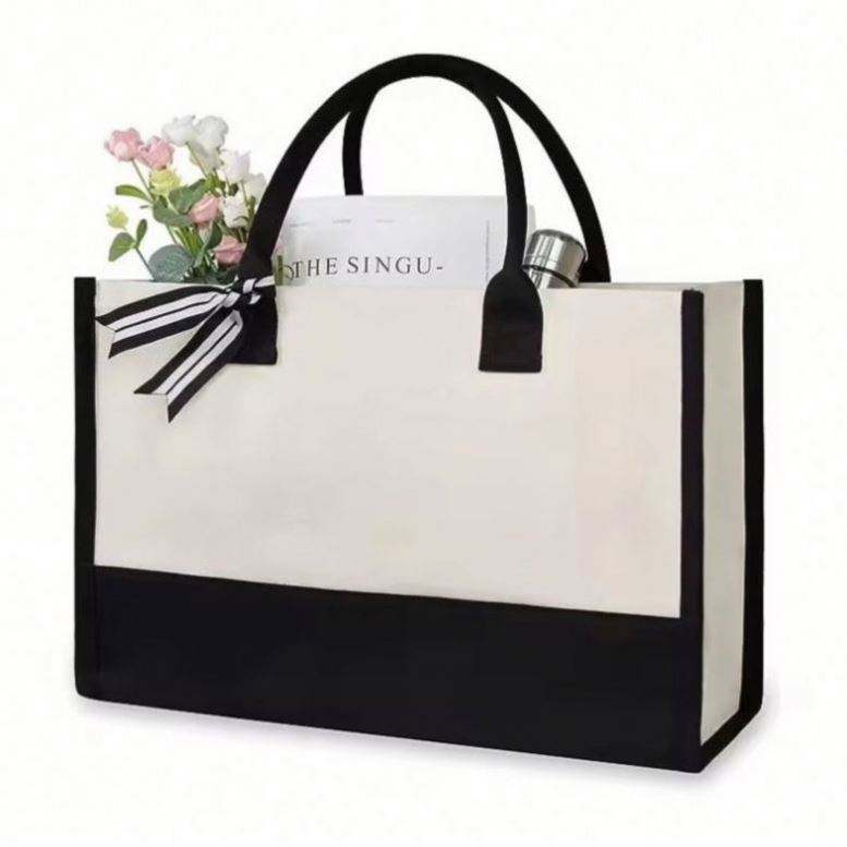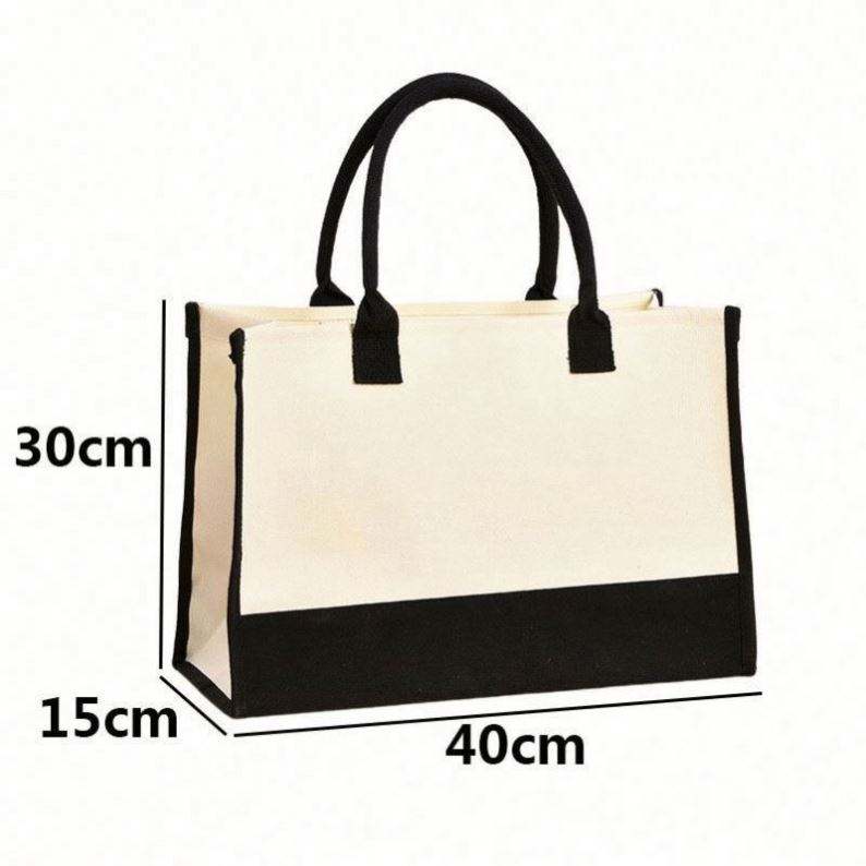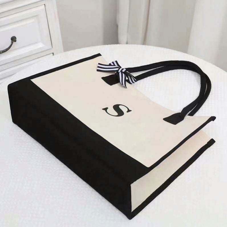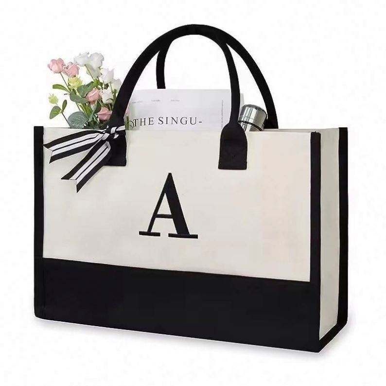 Sac de plage en toile personnalisé avec 26 lettres initiales, réutilisable, classique noir et blanc, sac fourre-tout en toile vierge, sac cadeau avec logo personnalisé