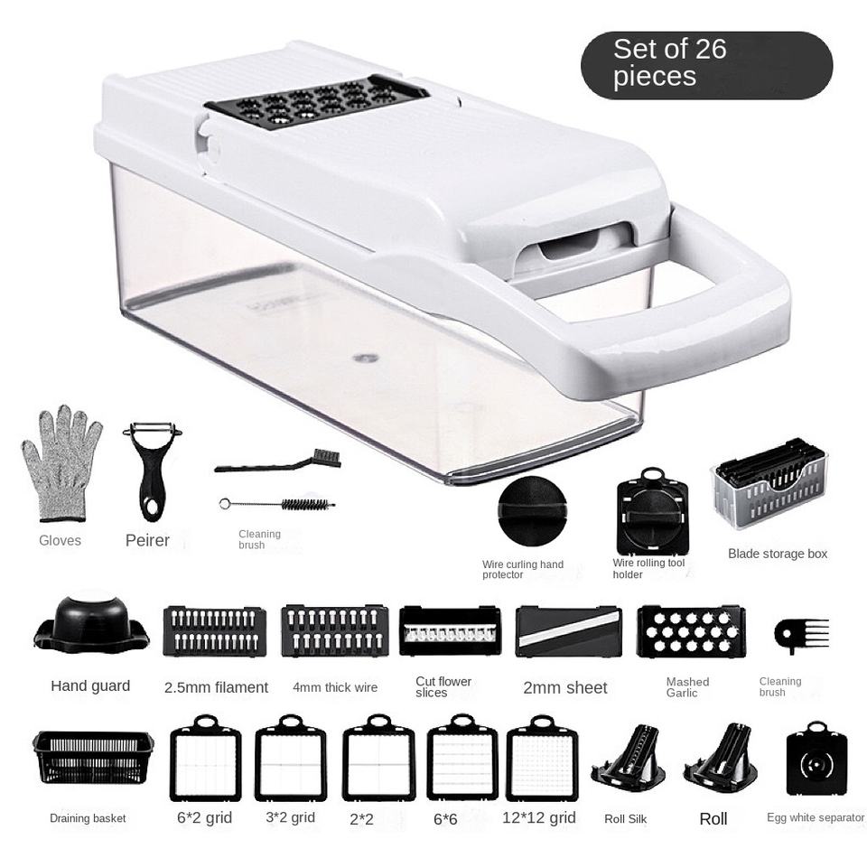 Hachoir à légumes multifonction 26-en-1 avec récipient, lames pour hacher et trancher les oignons, mandoline et trancheuse