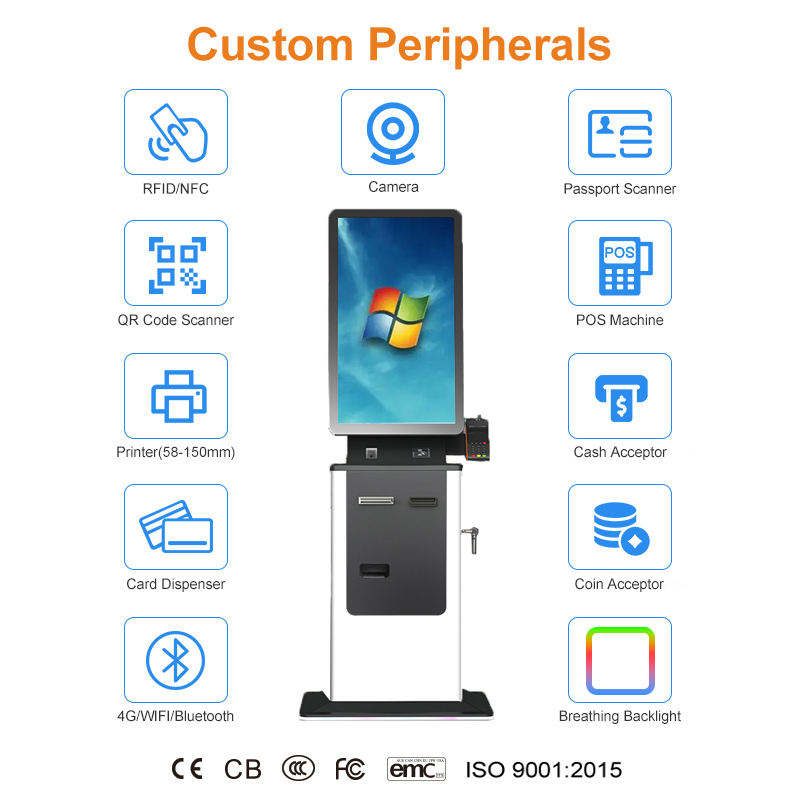 Kiosque de libre-service pour hôtel avec écran tactile de 27'' et 32'', pour hall d'hôtel, enregistrement et départ, lecteur, scanner, imprimante, paiement en espèces