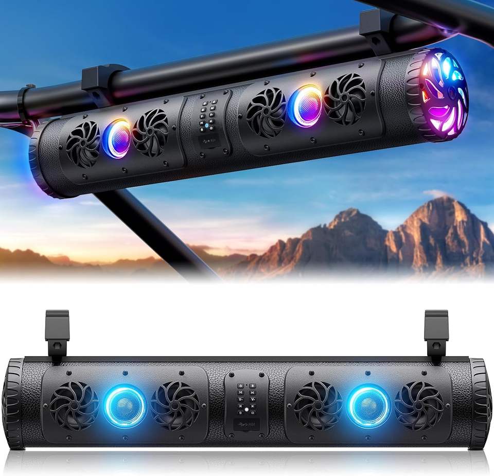 Barre de son UTV 27 pouces, système de son stéréo Bluetooth ATV Barre de son avec lumière de chasse multicolore Barre de son étanche pour voiturette de golf