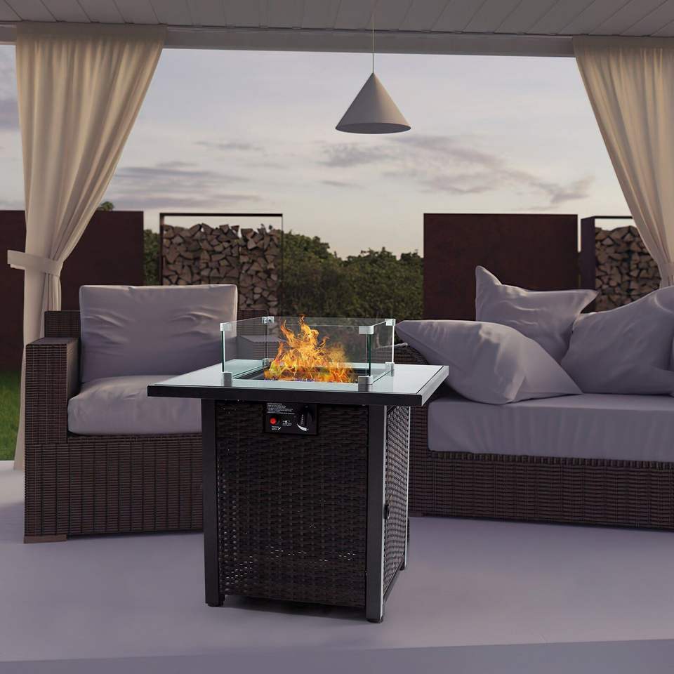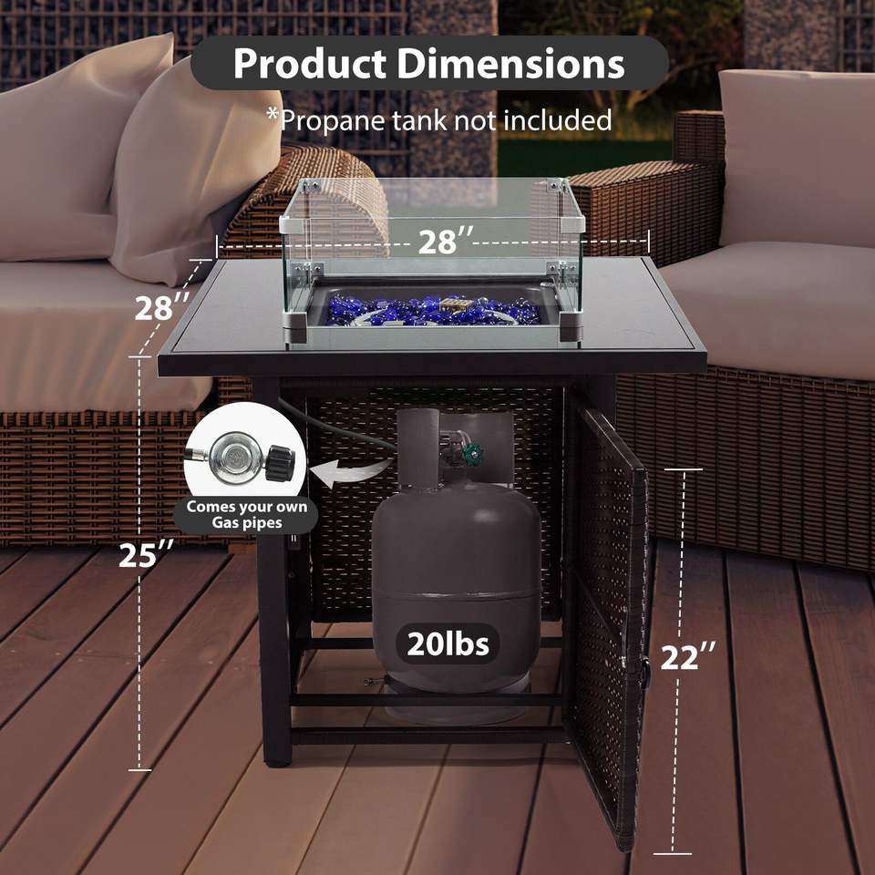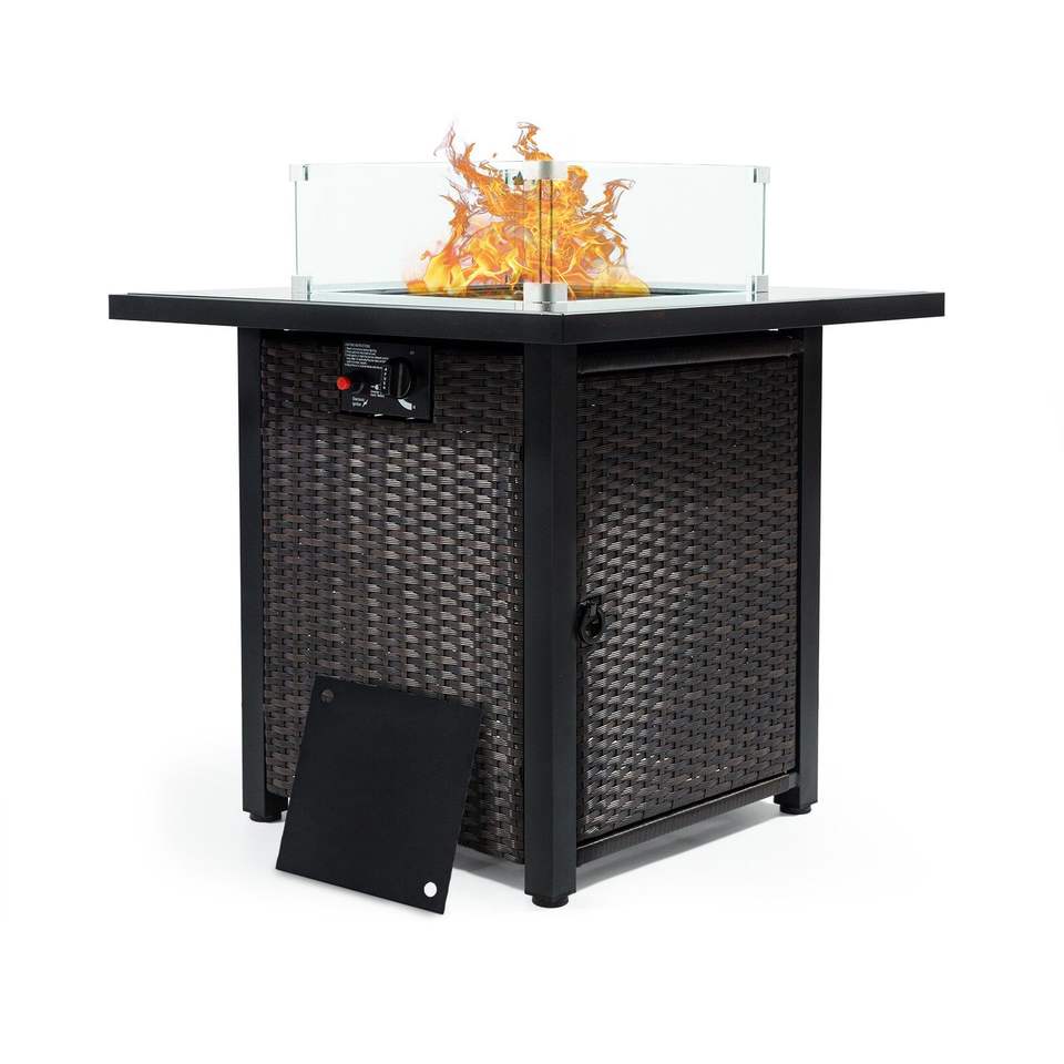 Table de foyer au propane de 28 pouces avec 50 000 BTU, plateau en verre trempé, couvercle en acier bleu, design carré coupe-vent