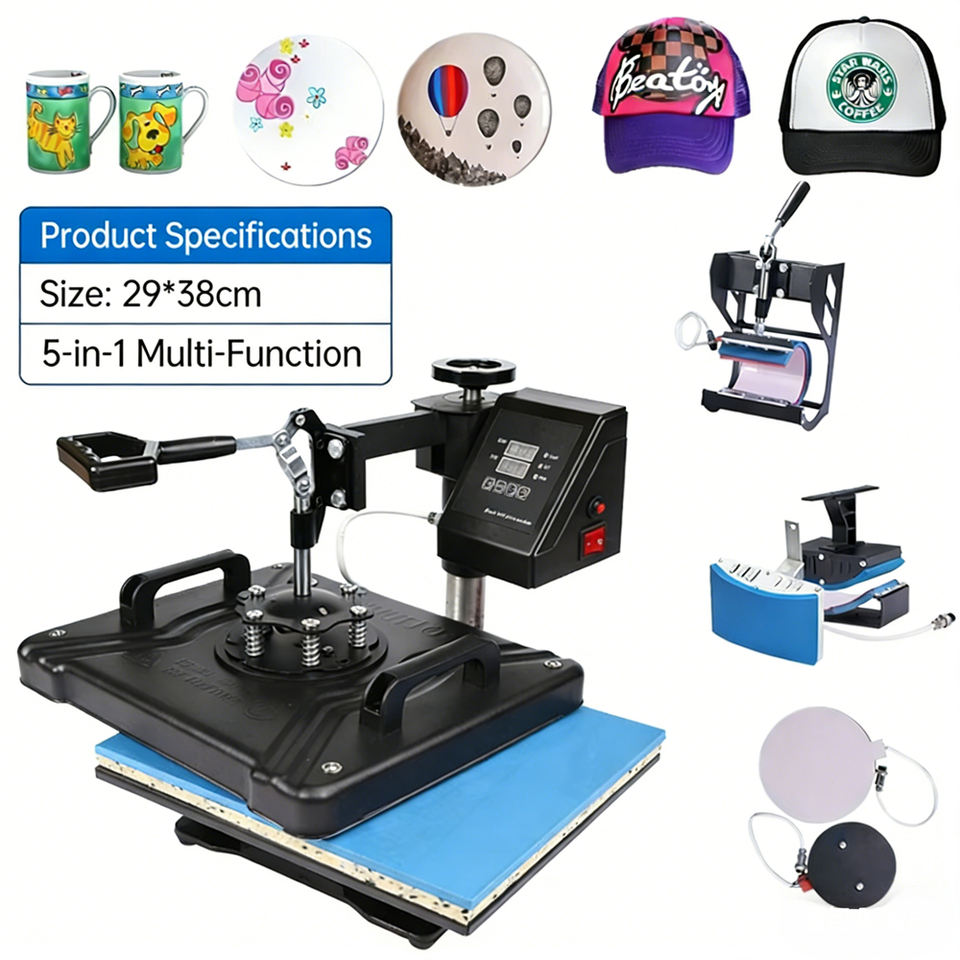 Presse à chaud multifonctionnelle 5 en 1 de 29*38 cm avec tête rotative pour T-shirts, mugs, coques de téléphone