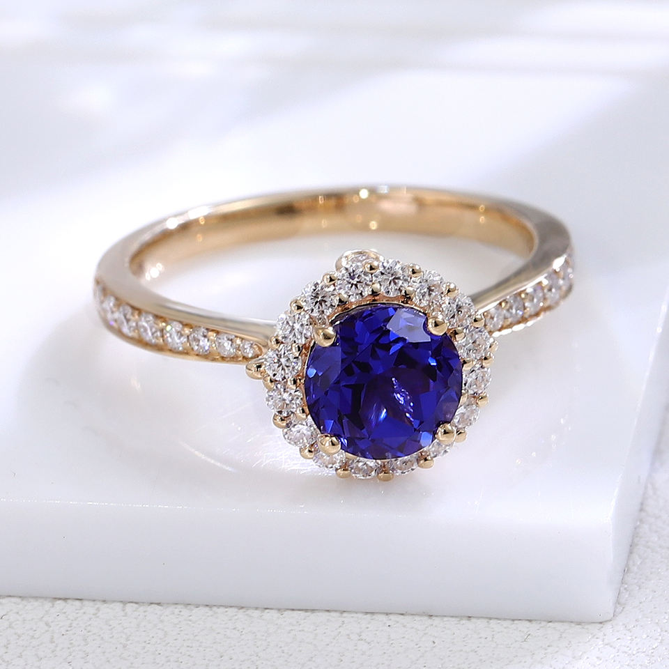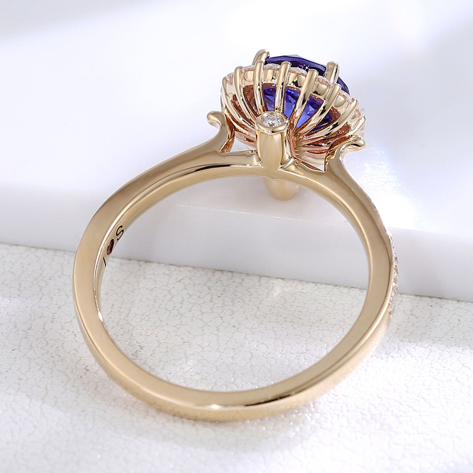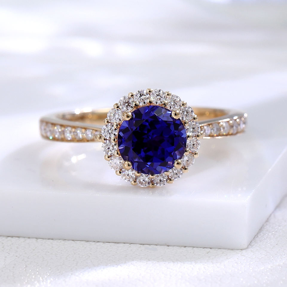 Bague saphir cultivé en laboratoire 2CT pierre principale en or jaune 14 carats 8mm saphir rond bleu cultivé en laboratoire avec bague de fiançailles Moissanite