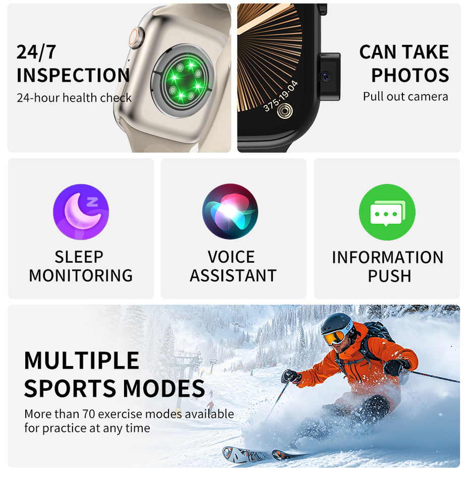 Podomètre, Chronographe, Calendrier, Alarme horloge, Télécommande, Compte à rebours, Sommeil, Compteur de pas, Rappel de Téléphone, Répondre à un appel, Lancer essage, Rappel de message, Composez un numéro, Fréquence cardiaque Tracker, Contrôle des gestes, Compteur intelligent, Les Médias sociaux Notifications, Moniteur de Souffle, Traqueur de Distance, Lecteur de musique, Rappel sédentaire, Assistant vocal AI, Calculatrices, positionnementFonction