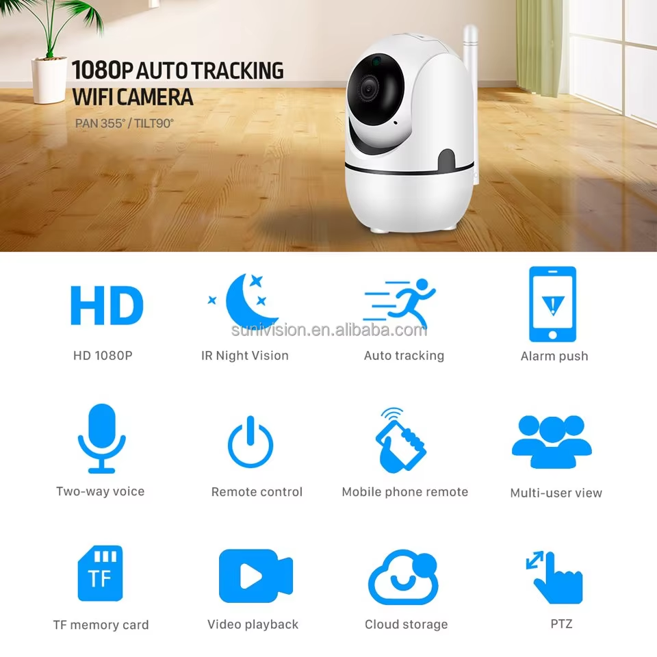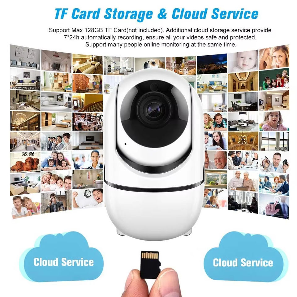 Vision nocturne, Audio bidirectionnel, L'homme De Suivi De Mouvement, Détection de mouvement, Détection sonore, Built-in Sirène, PAN-TILT, Audio à sens unique, Support Cloud Stockage/Max 128GB TF/Carte SD