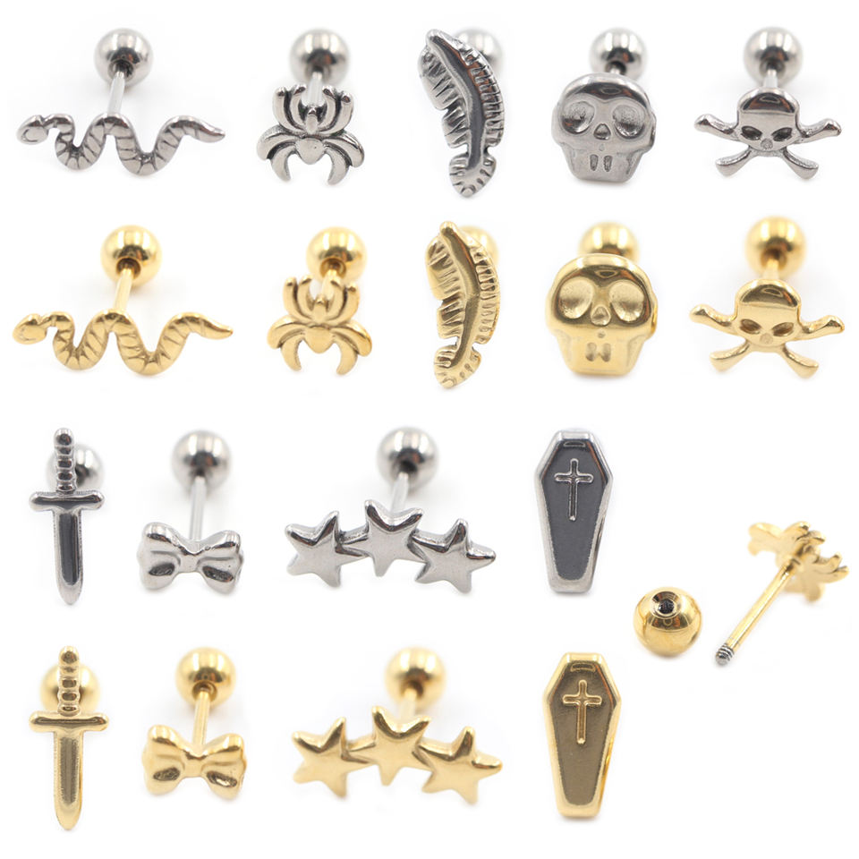 2 pièces Bijoux de piercing en Titane : Croix, Araignée, Serpent, Crâne, Épée, Arc, Plume, Étoile, Cercueil, Clou d'oreille, Boucle d'oreille hélix, Anneau de langue