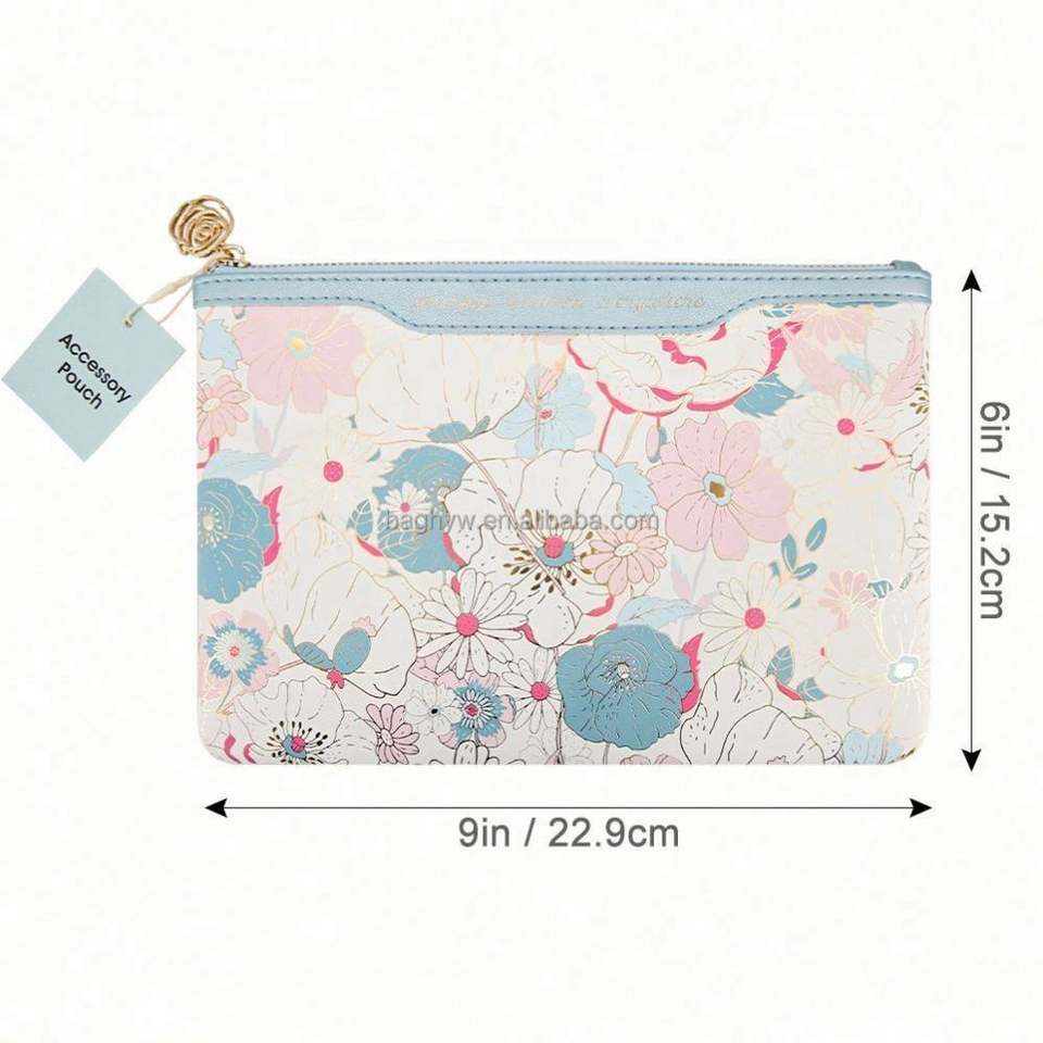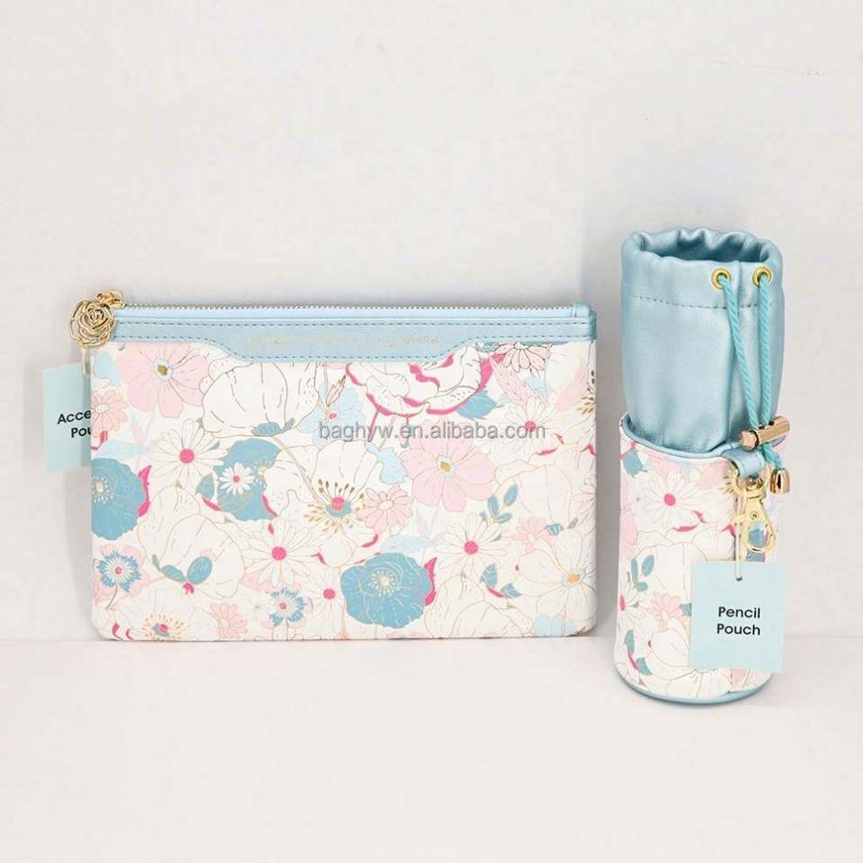 Ensemble de 2 trousses à maquillage en cuir PU bleu floral de luxe, étiquette privée, design original pour femmes