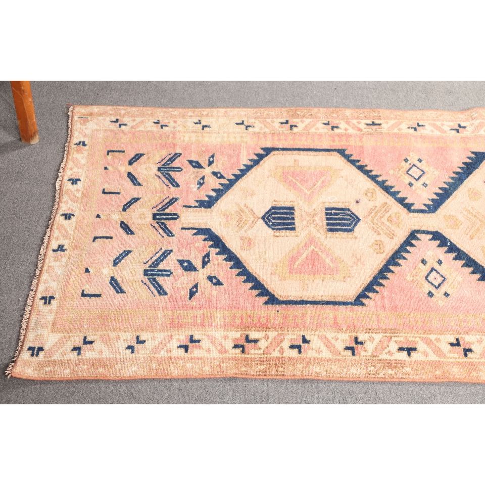 Tapis turc 3,37 x 6,2 pieds, petit tapis vintage, tapis géométrique rose et bleu