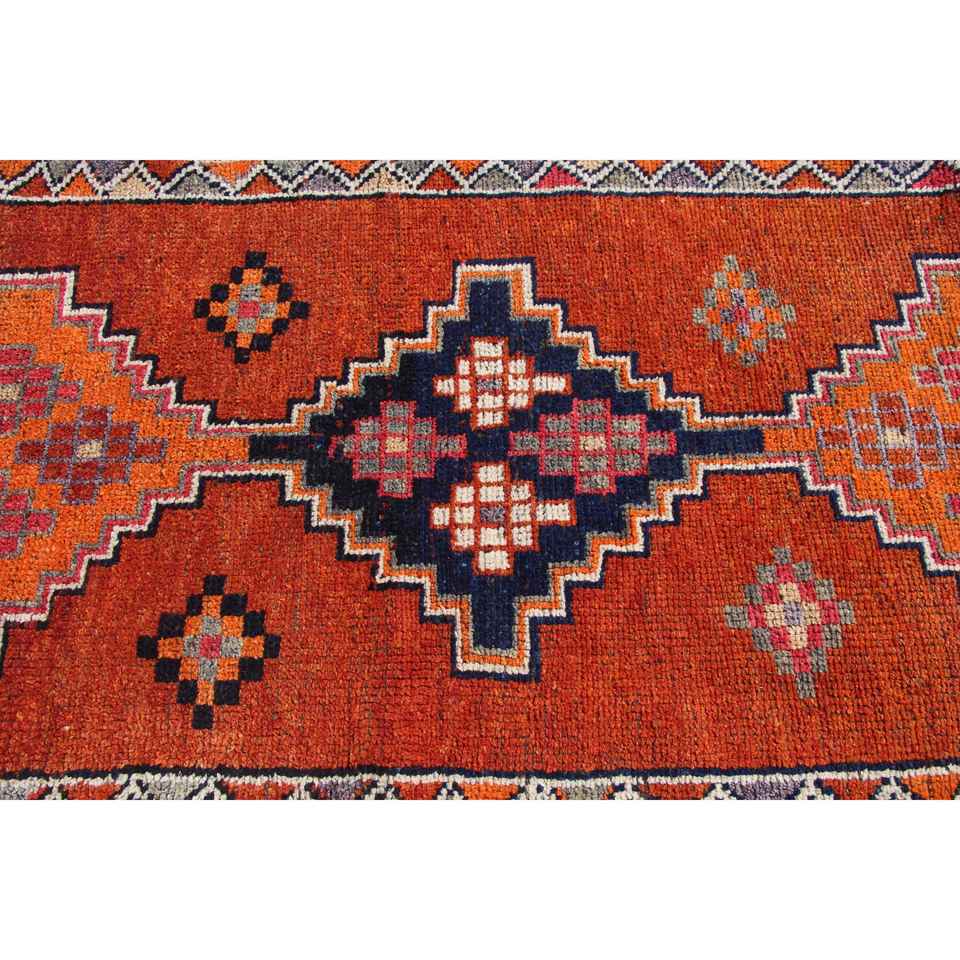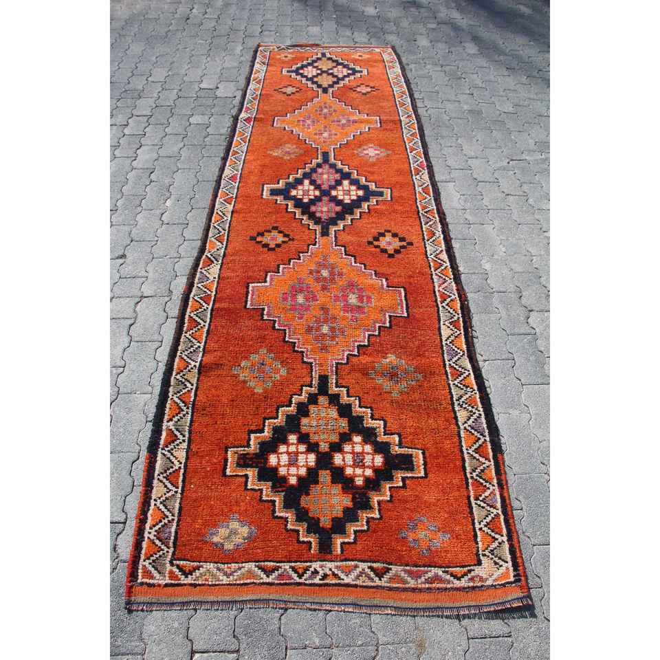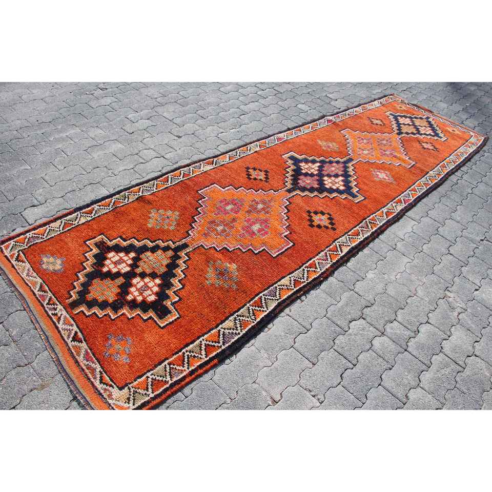 Tapis de 3,3 x 11,5 pieds, tapis turc vintage, tapis persan en laine orange et bleu