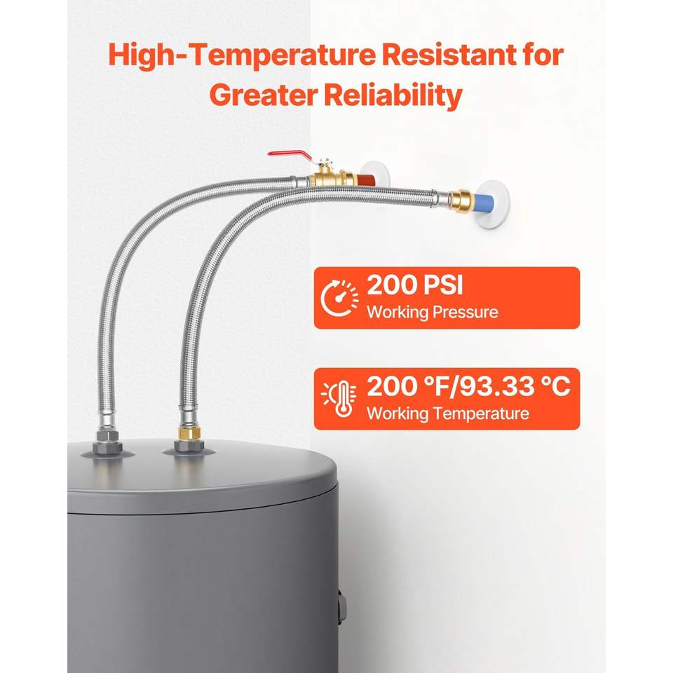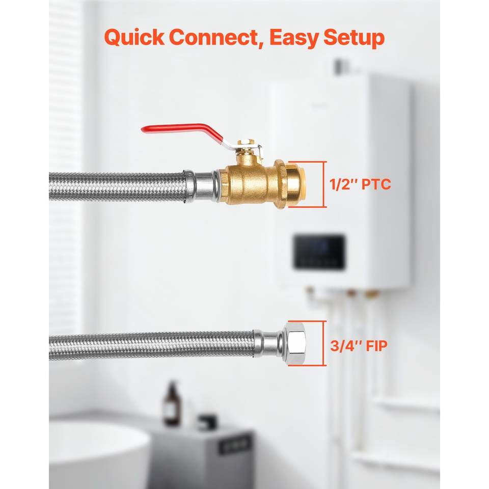 Kit de raccordement flexible pour chauffe-eau avec vanne à bille en acier inoxydable tressé de 3/4 po FIP x 1/2 po PTC, à raccord rapide, pour tuyaux de plomberie