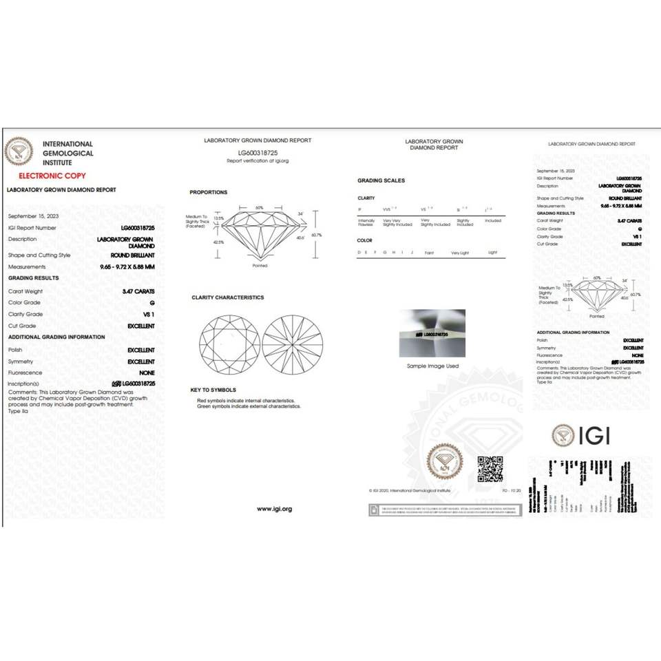 3.47ct Round Brilliant Cut Lab-grown Diamond IGI Certified G Color VS1 Clarity Lab-Stone