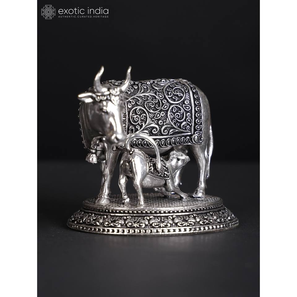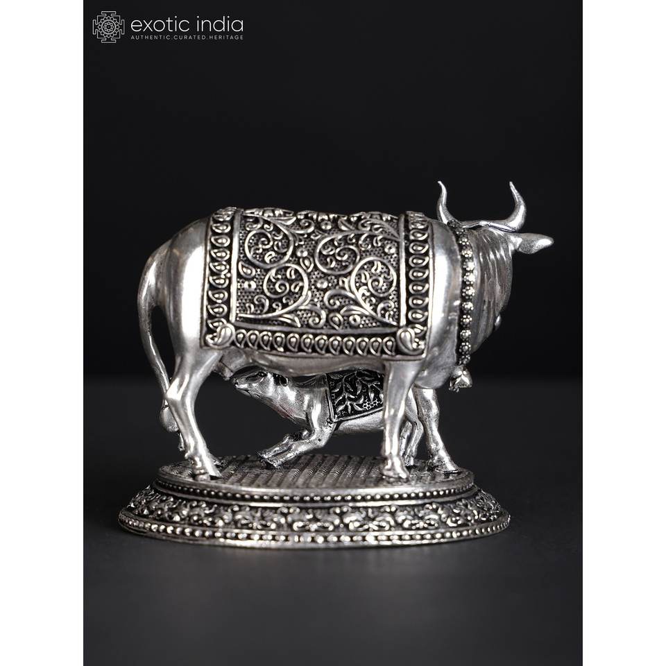 Petite statue de vache et de veau en laiton plaqué argent de 3.5 pouces avec sculpture attrayante pour la décoration intérieure, les cadeaux et le temple fabriqués en Inde