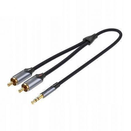 3.5mm male to 2x RCA male stereo cable, 3m, grey; ideal for connecting audio devices to sound systems.