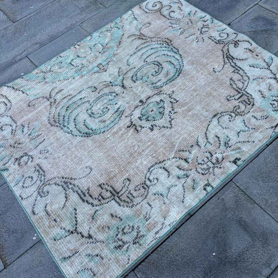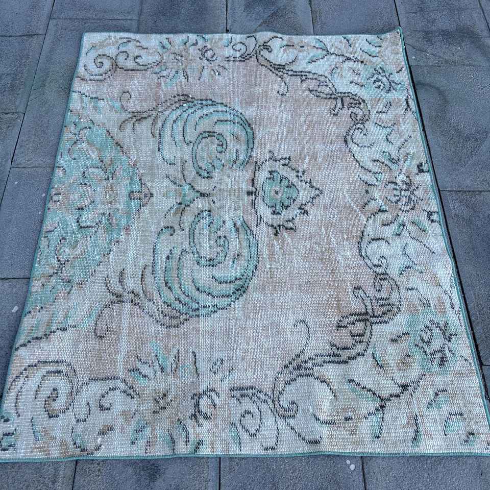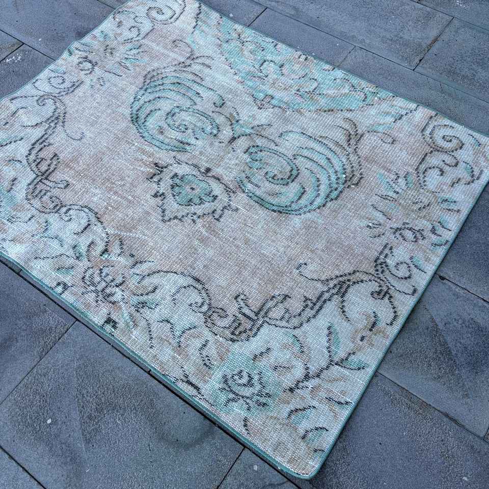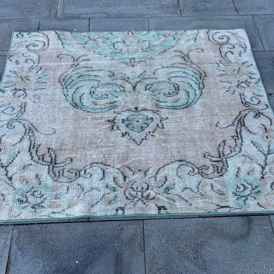 Tapis turc 3,5 x 4,4 pieds, tapis d'appoint vintage, tapis oriental bleu et marron