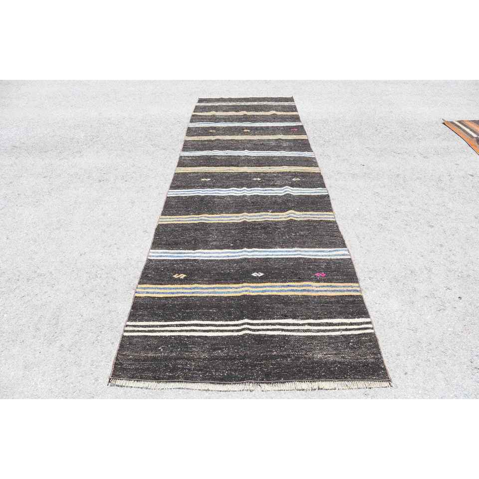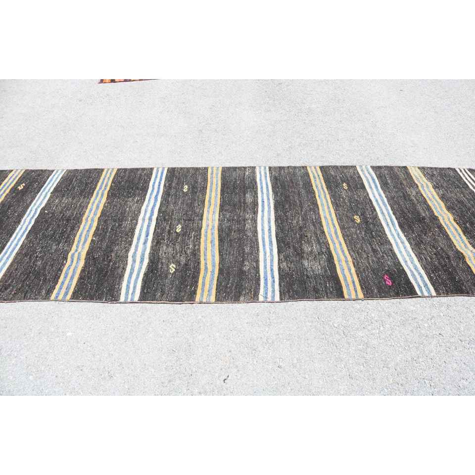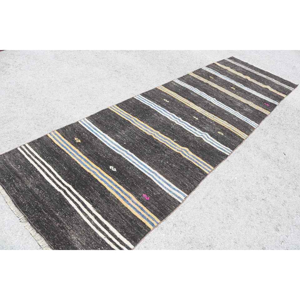 Tapis turc 3,7 x 12,3 pieds, tapis de couloir vintage, tapis bleu noir style sud-ouest