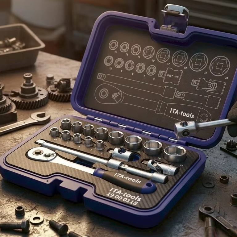 Jeu de douilles à main de 18 pièces de 3/8 pouces en acier au chrome-vanadium à 6 pans, fabrication ODM/OEM à Taïwan, avec coffret moulé par soufflage