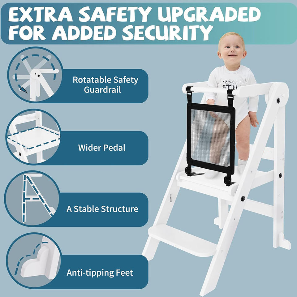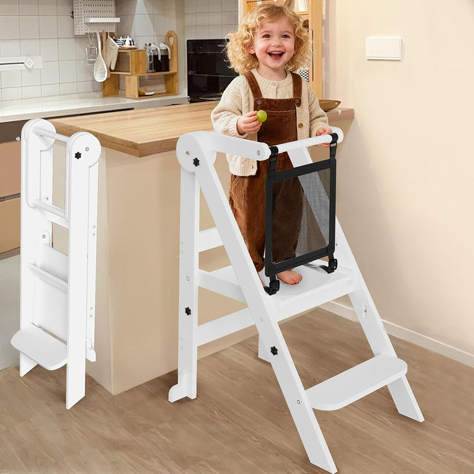 Tabouret de cuisine pliable en bois pour enfants à 3 hauteurs réglables, tour d'apprentissage Montessori pour enfants avec barres de sécurité