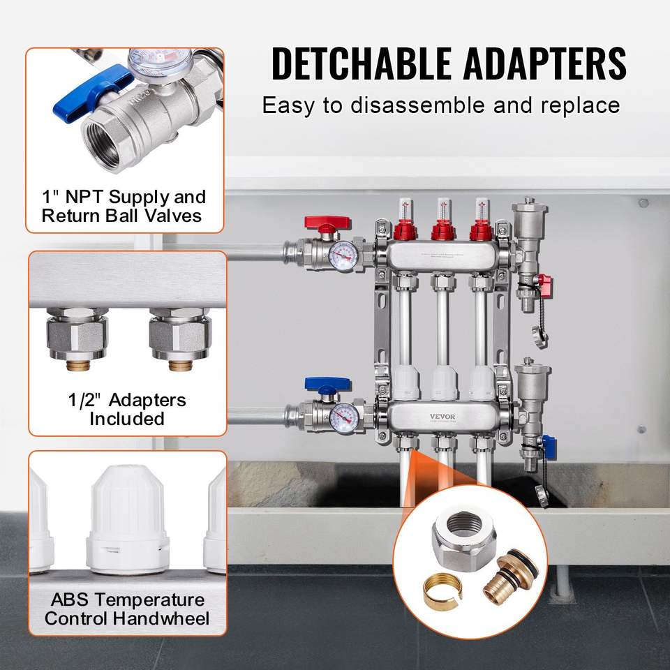 Collecteur de chauffage radiant à 3 branches en acier inoxydable 1/2 po pour tubes PEX – Pièces de chauffage radiant hydronique pour systèmes de chauffage par le sol