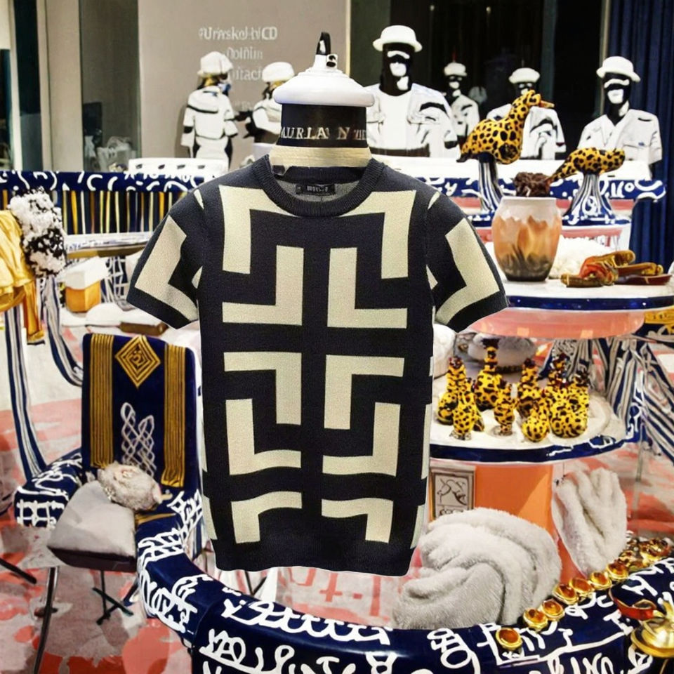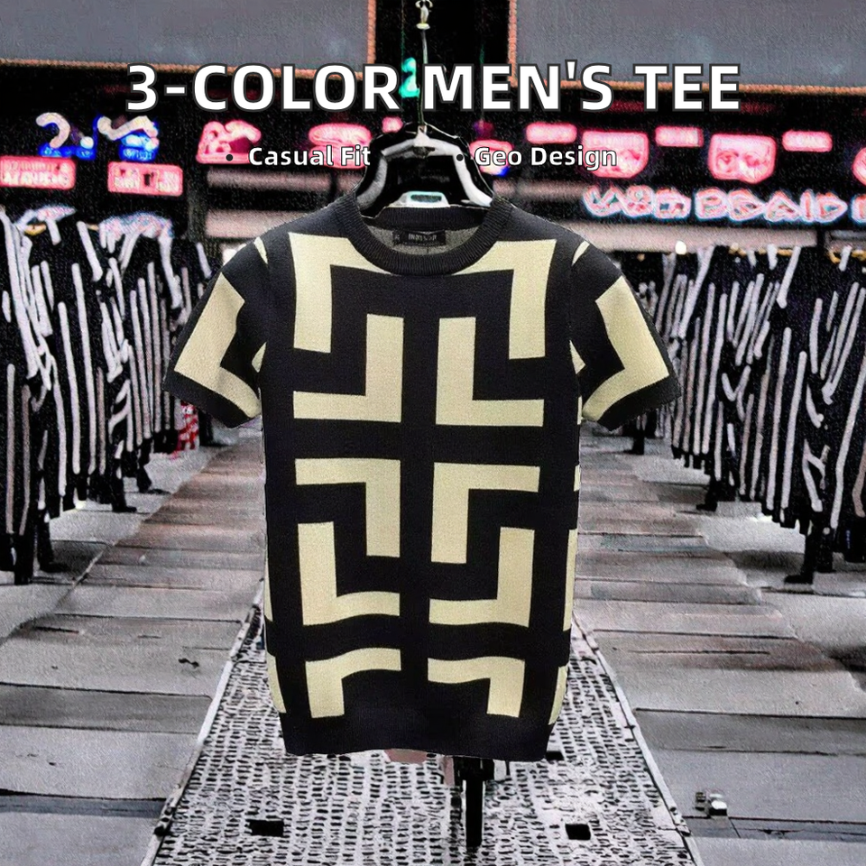 T-shirt en mélange de chanvre respirant et écologique pour homme, motif géométrique tricoté, teinture dip 3 couleurs, coupe ajustée, style décontracté streetwear et club social