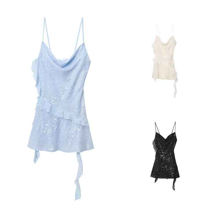 Robe d'été décontractée pour femmes, mini-robe à bretelles spaghetti, col tombant, volants, paillettes, couleur unie, 3 coloris