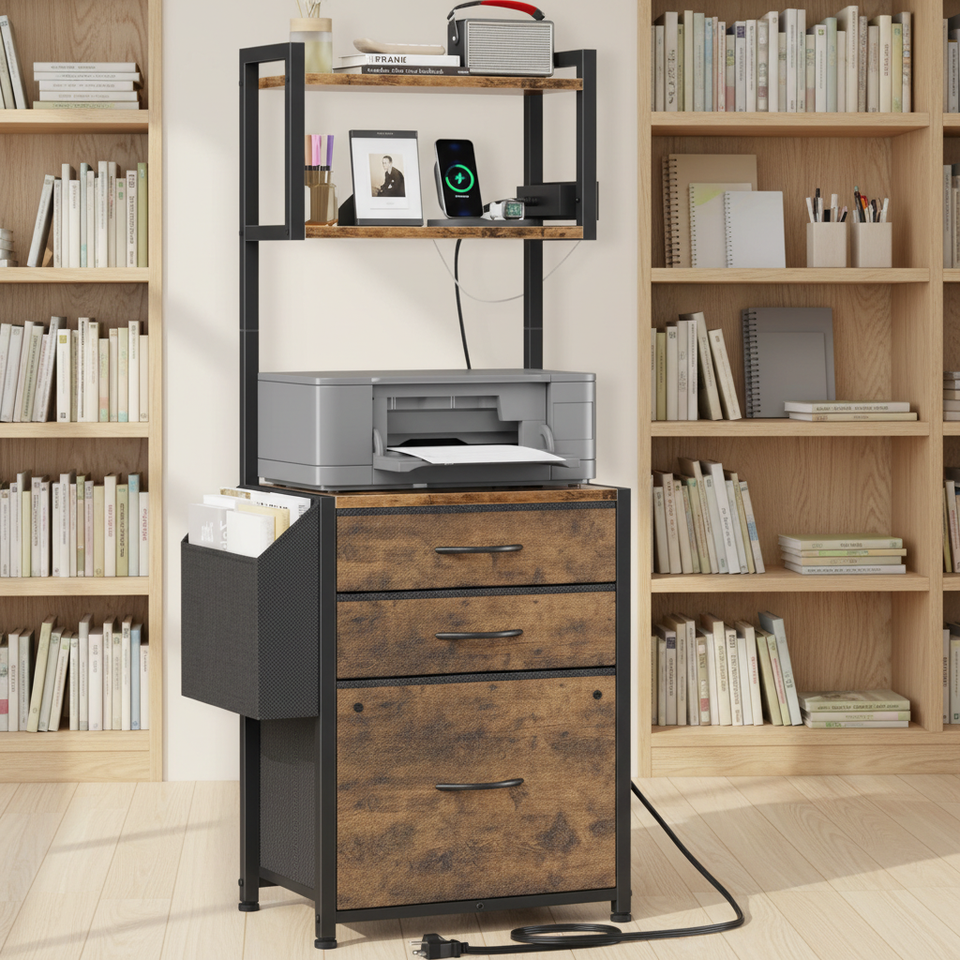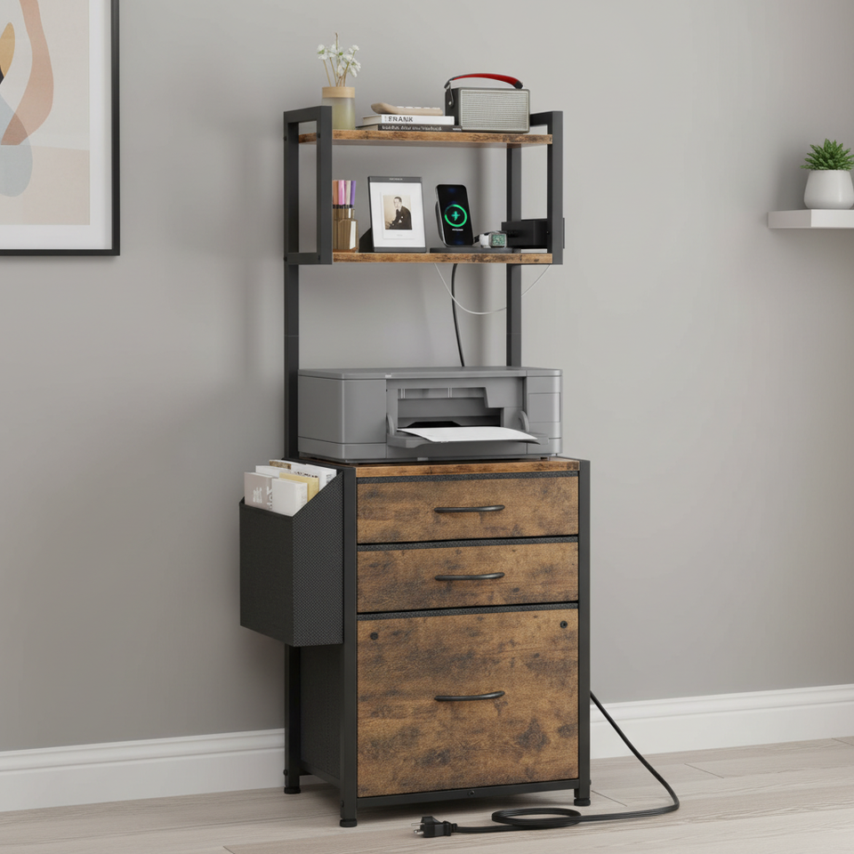Meuble de rangement en bois à 3 tiroirs avec station de charge pour bureau à domicile, support d'imprimante multifonctionnel haut de gamme à grande capacité