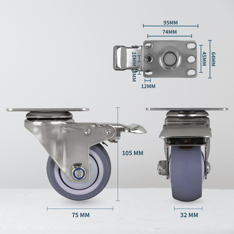 Nom du produit:Roulette pivotante 3 pouces en acier inoxydable 304 avec frein et revêtement TPR
