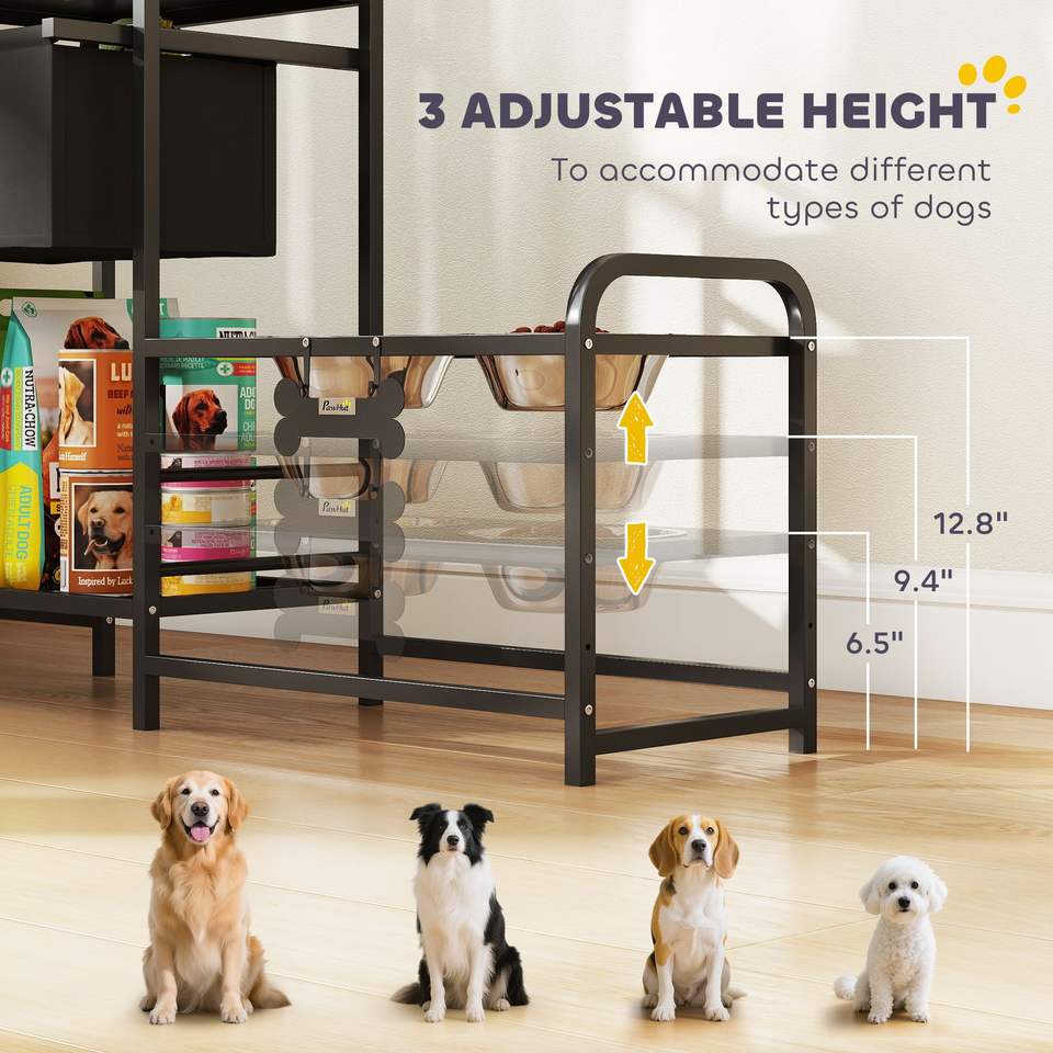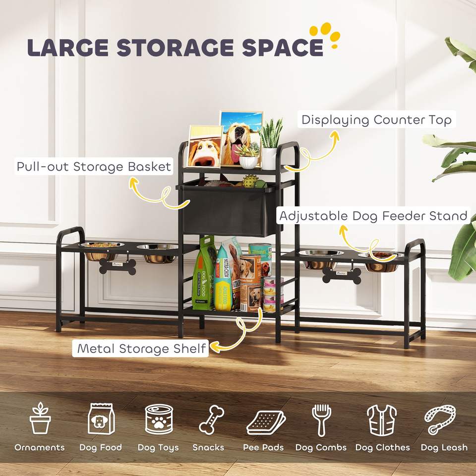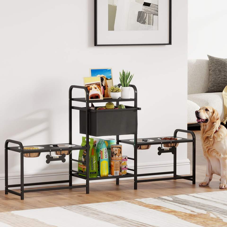 Support de gamelle pour chien réglable sur 3 niveaux, noir, avec 2 stations d'alimentation et panier de rangement pour jouets, pour l'alimentation multi-niveaux des animaux de compagnie