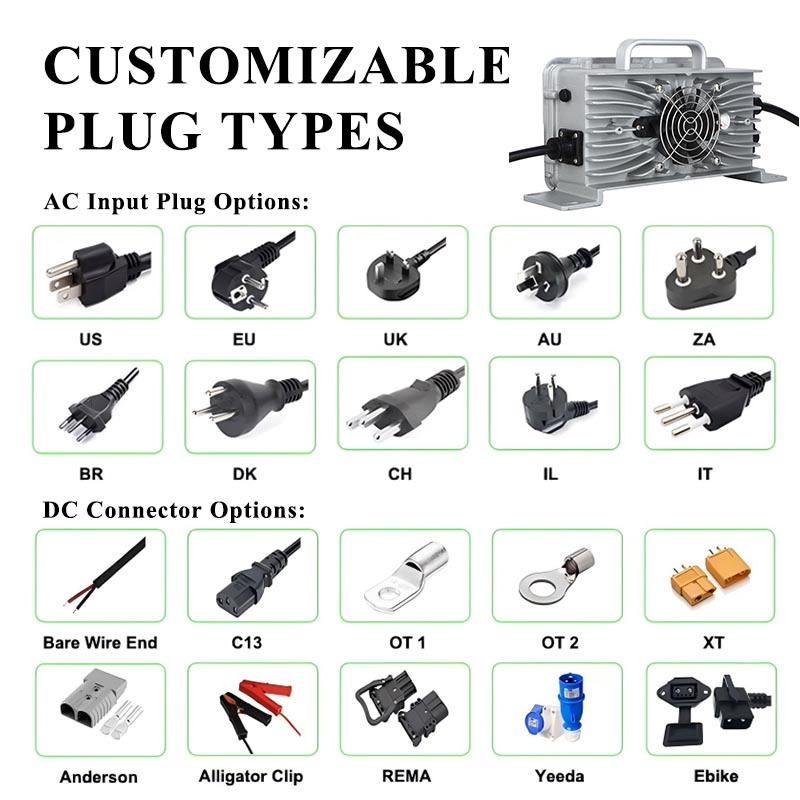 12 V 50 A, 14,6 V 50 A, 16,8 V 50 A, 24V 30A, 29,2 V 30 A, 29,4 V 30 A, 36V 30A, 43,8 V 30 A, 42V 30A, 48V 18A 25A, 58,4 V 18 A 25 A, 58,8 V 18 A 25 A, 60V 15A 20A, 73V 15A 20A, 67,2 V 15 A 20 A, 72V 12V 15A, 87,6 V 12 V 15 A, 84V 12V 15A, 84V 10A 13A, 102,2 V 10 A 13 A, 100,8 V 10 A 13 A, 96V 9A 12A, 116,8 V 9 A 12 A, 117,6 V 9 A 12 A, 65 A, 65 ampèresSortie