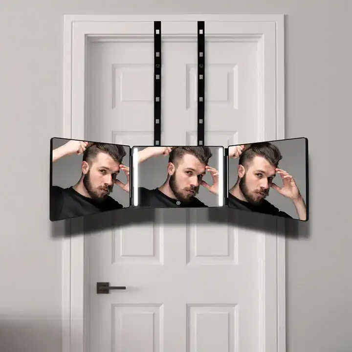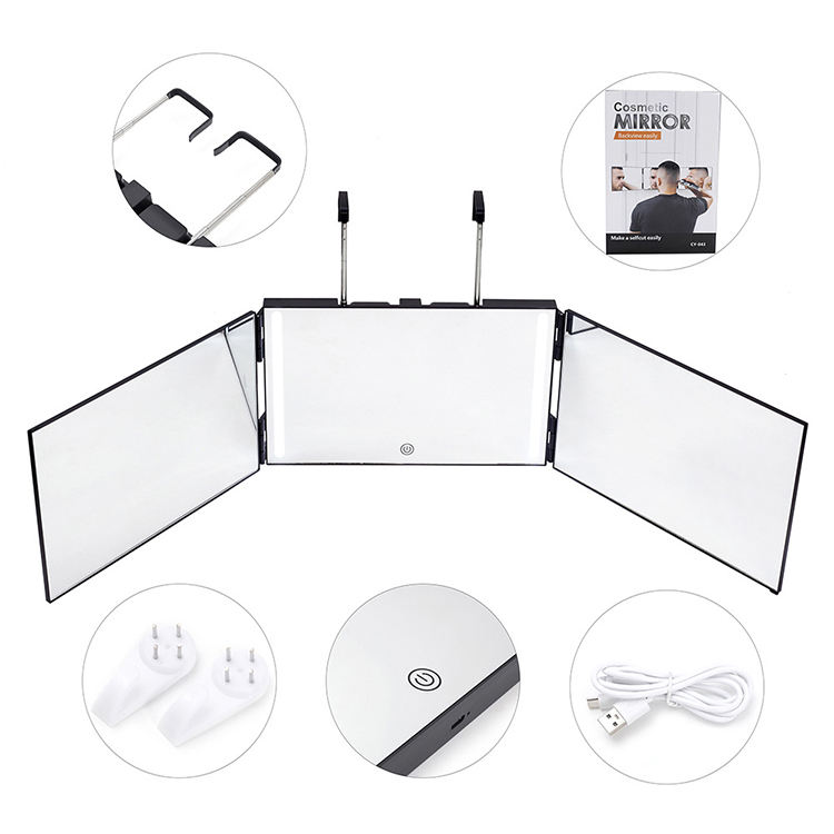 Miroir pliable à 3 voies avec 3 panneaux, rechargeable, éclairé, noir, portable, avec interrupteur tactile, pour la coupe de cheveux en solo