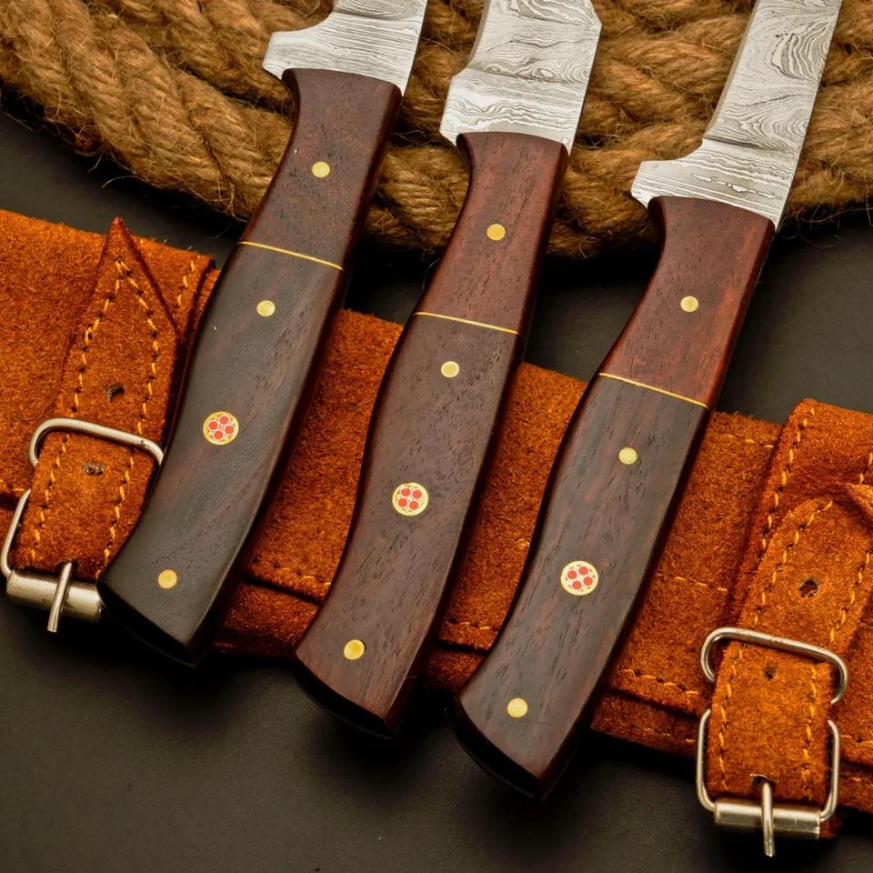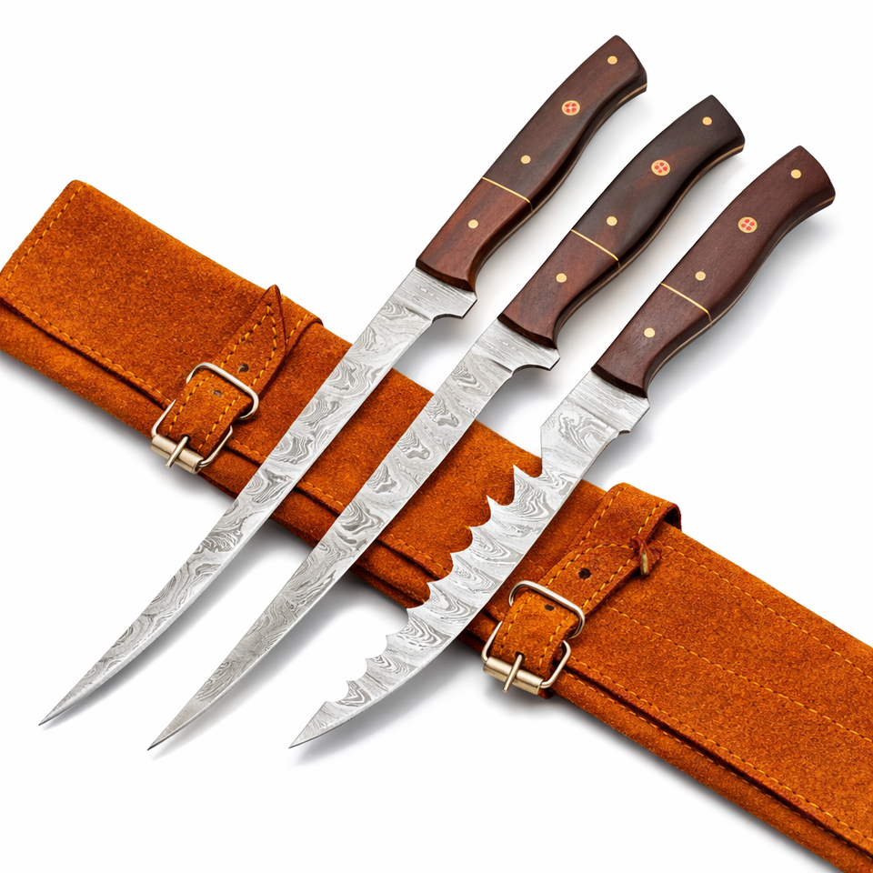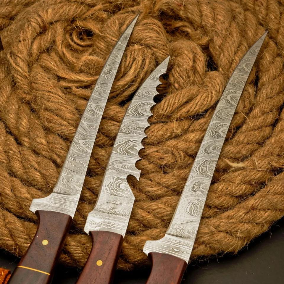 Ensemble de 3 couteaux à filet en acier damas fait main, couteau de pêche, meilleur cadeau pour les amateurs de pêche, couteau personnalisé, cadeau d'anniversaire