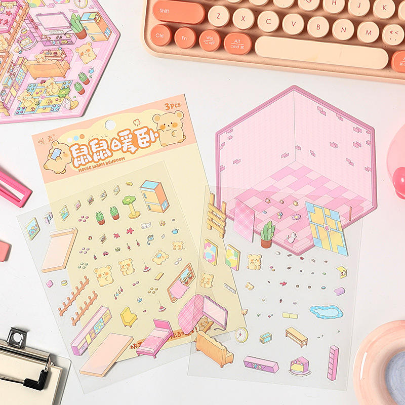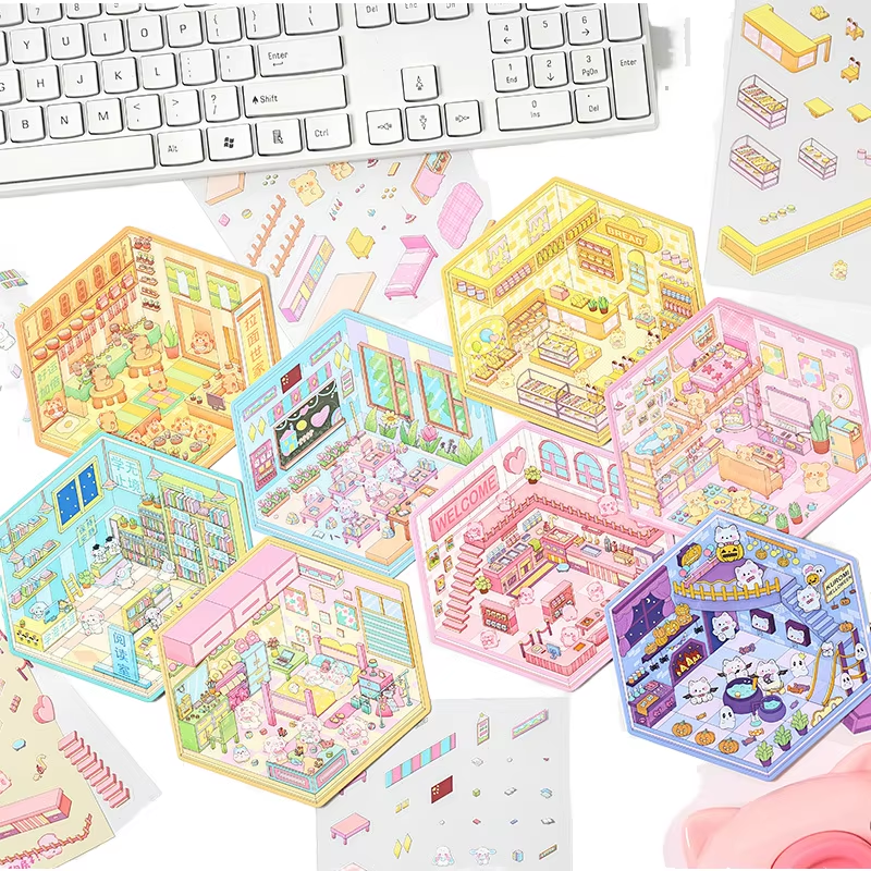 Lot de 3 autocollants laser - Scènes de cabanes miniatures en 3D, décorations de vacances autocollantes
