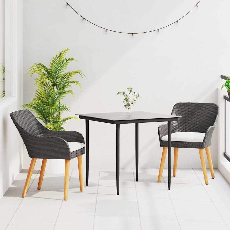 Ensemble de salle à manger de jardin en polyrotin noir, 3 pièces, avec coussins, meubles d'extérieur, style contemporain, cadre en acier, pieds en bois massif