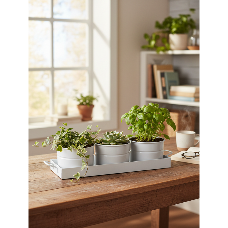 Ensemble de 3 pots de fleurs en métal avec plateau collecteur et poignées en fil – Ensemble de pots et plateau personnalisable |