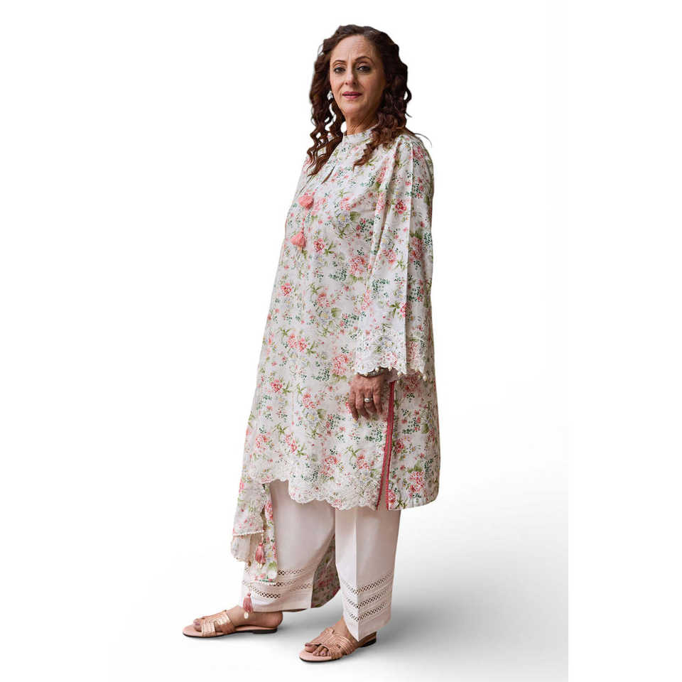 Ensemble 3 pièces en mousseline brodée et imprimée, avec dupatta brodée translucide à motifs, taille unique/XS/6XL pour événements - DN-62010