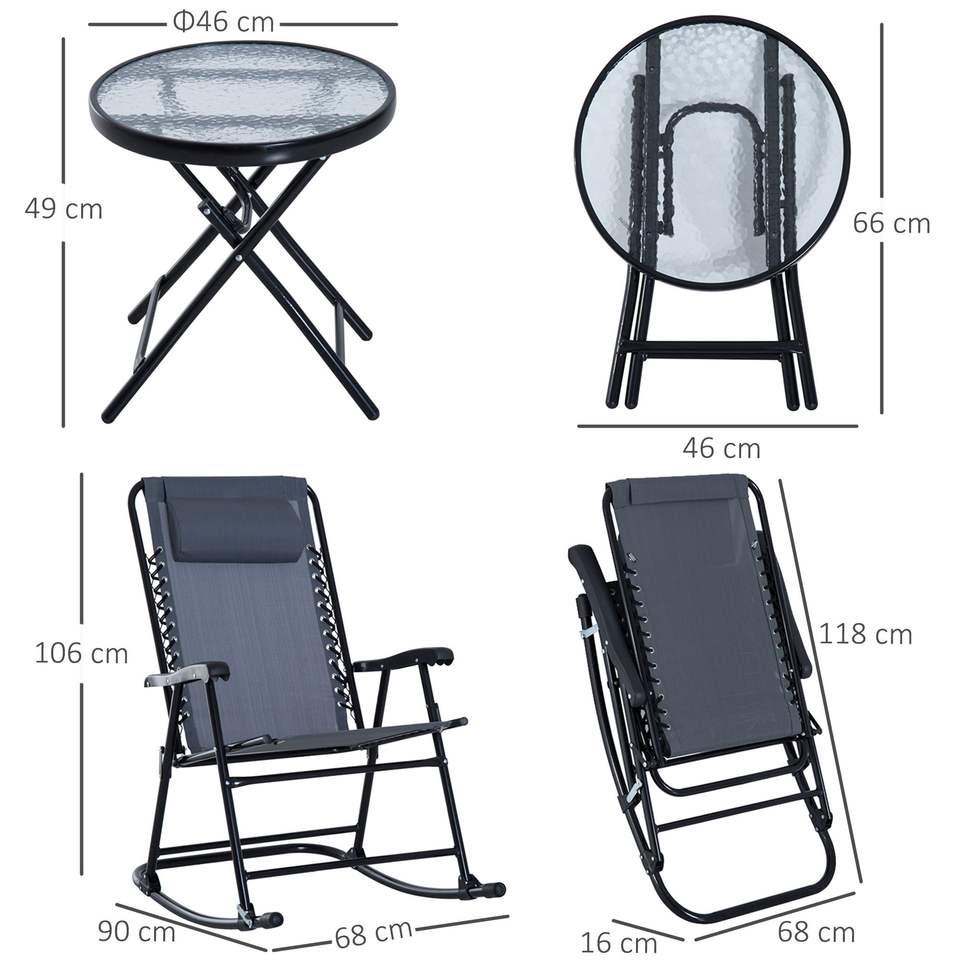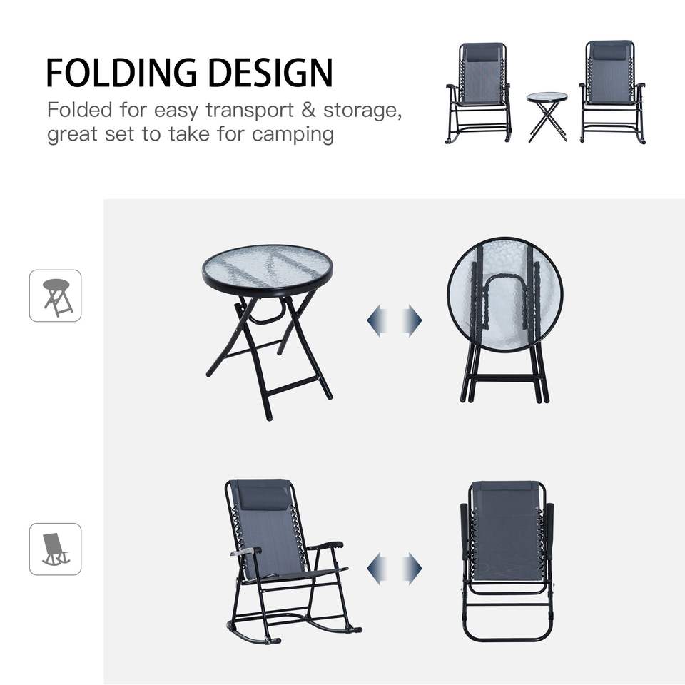 Ensemble de bistro à bascule gris 3 pièces pour l'extérieur Chaise pliante de patio Table avec café en verre pour cour Patio Deck Backyard