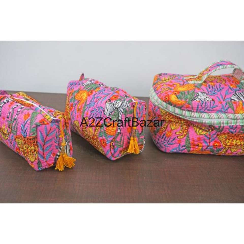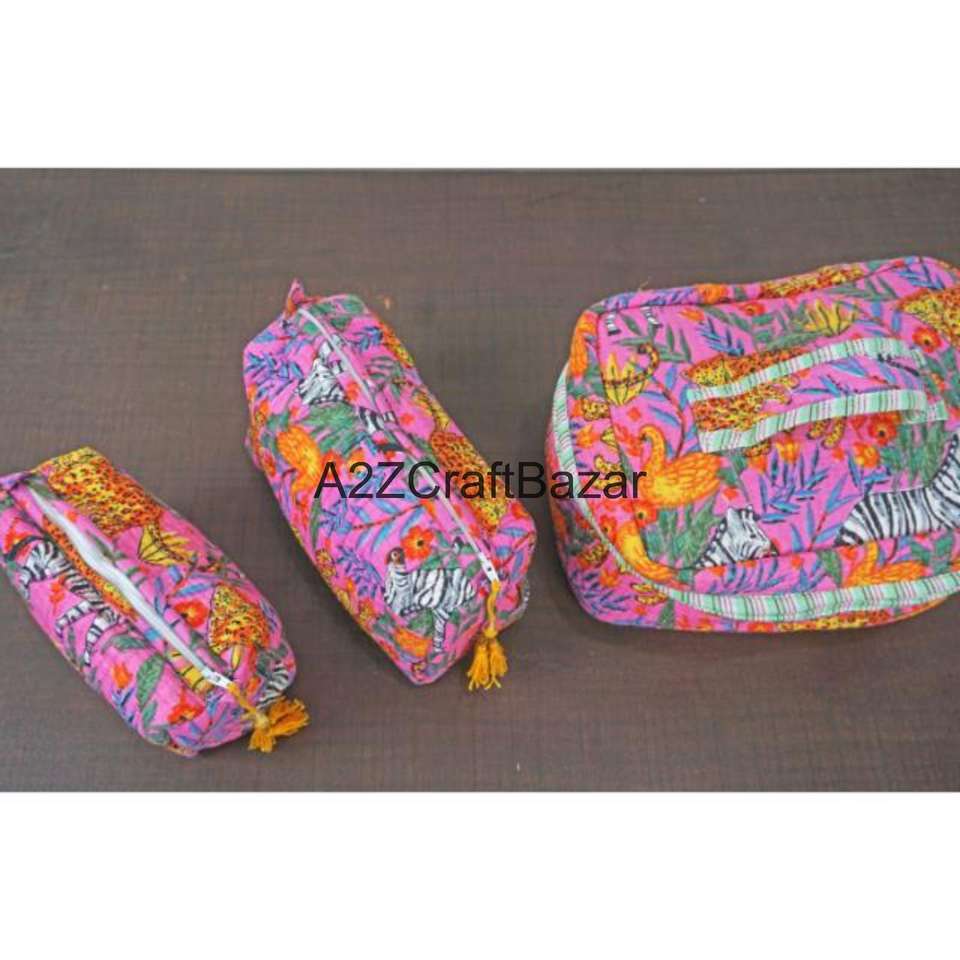 Ensemble de 3 trousses de toilette et de maquillage en coton imprimé à la main, grand format, avec fermeture éclair, imperméables, écologiques, durables, pour le voyage