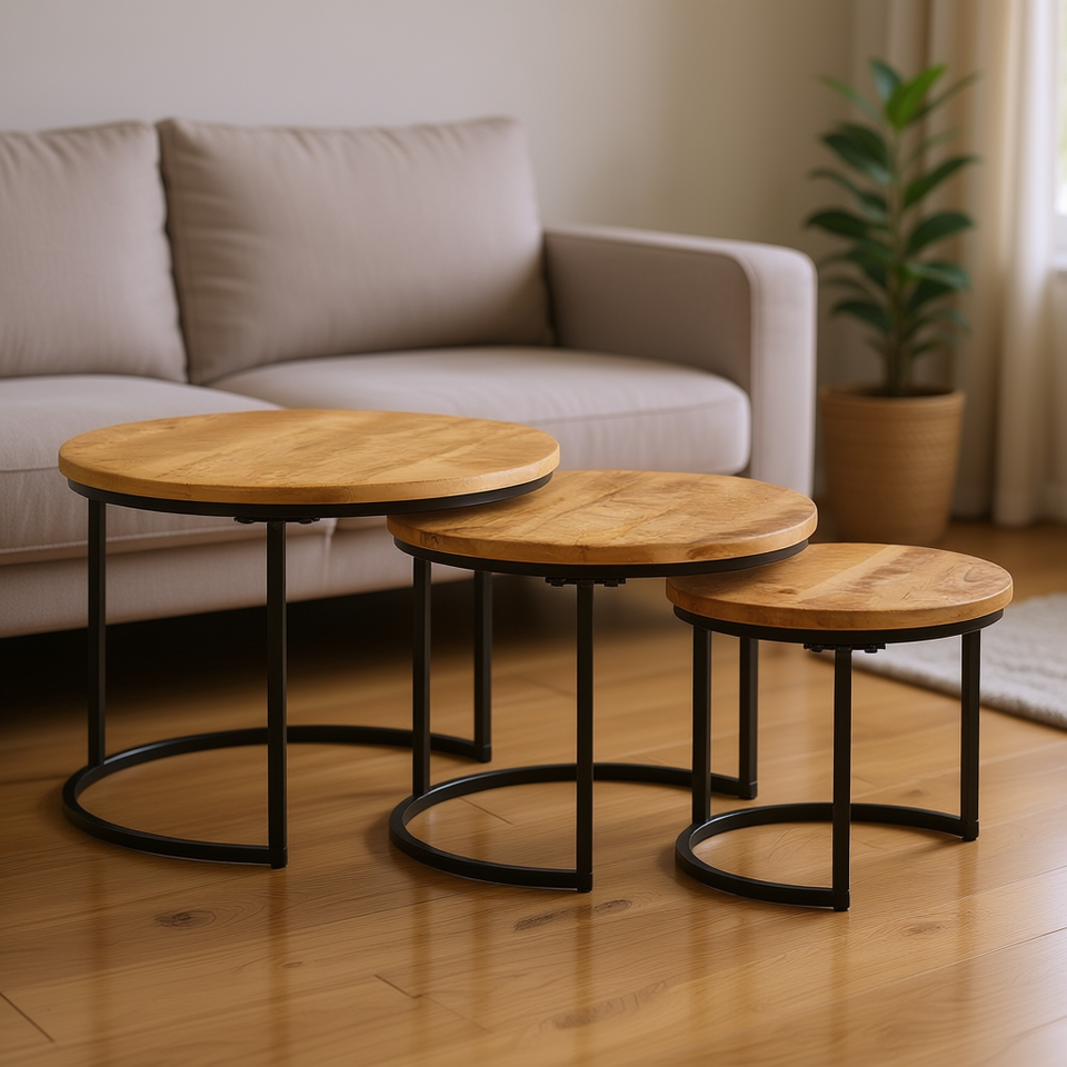 3 Piece Nesting Tables Solid Mango Wood Round Coffee Table Living Room Furniture Modern Rustic Design
