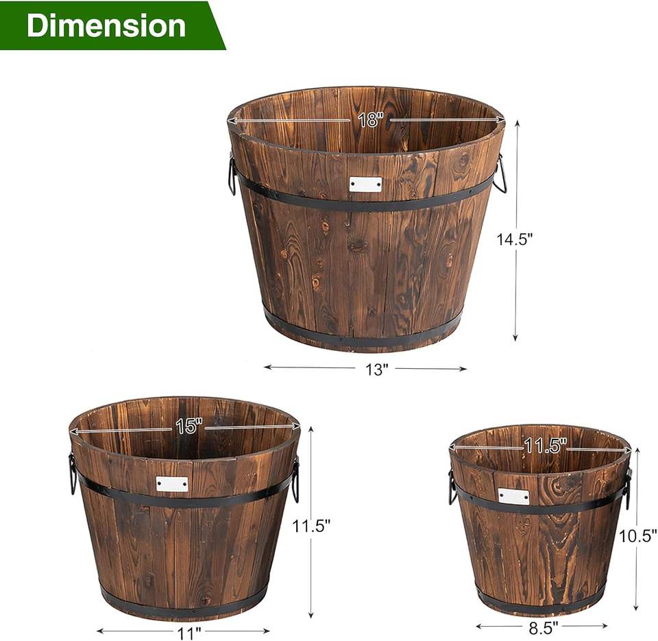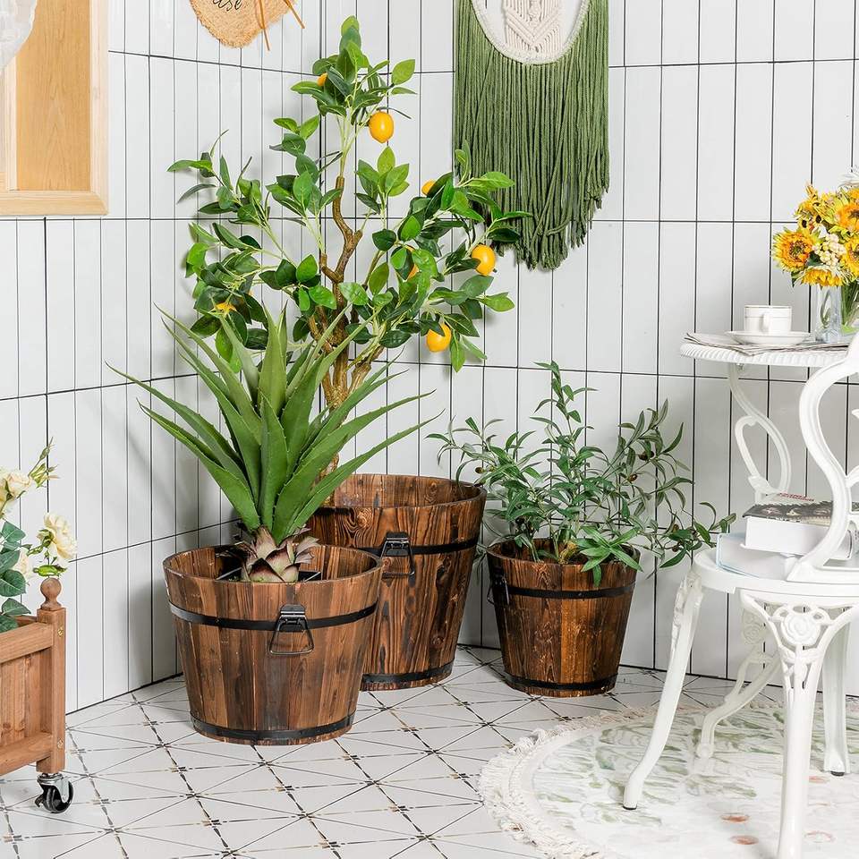 Jardinière vintage en forme de tonneau, 3 pièces, seau en bois, lits surélevés pour plantes, herbes, légumes, intérieur, extérieur, jardin, boîte à fleurs décorative