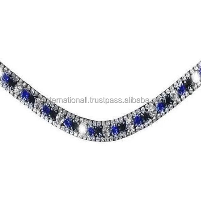 Bande de sourcils de cheval en cuir italien de haute qualité, 3 rangées de pierres scintillantes bleues, en forme deep wave, toutes tailles