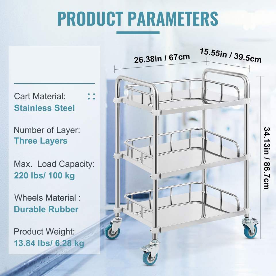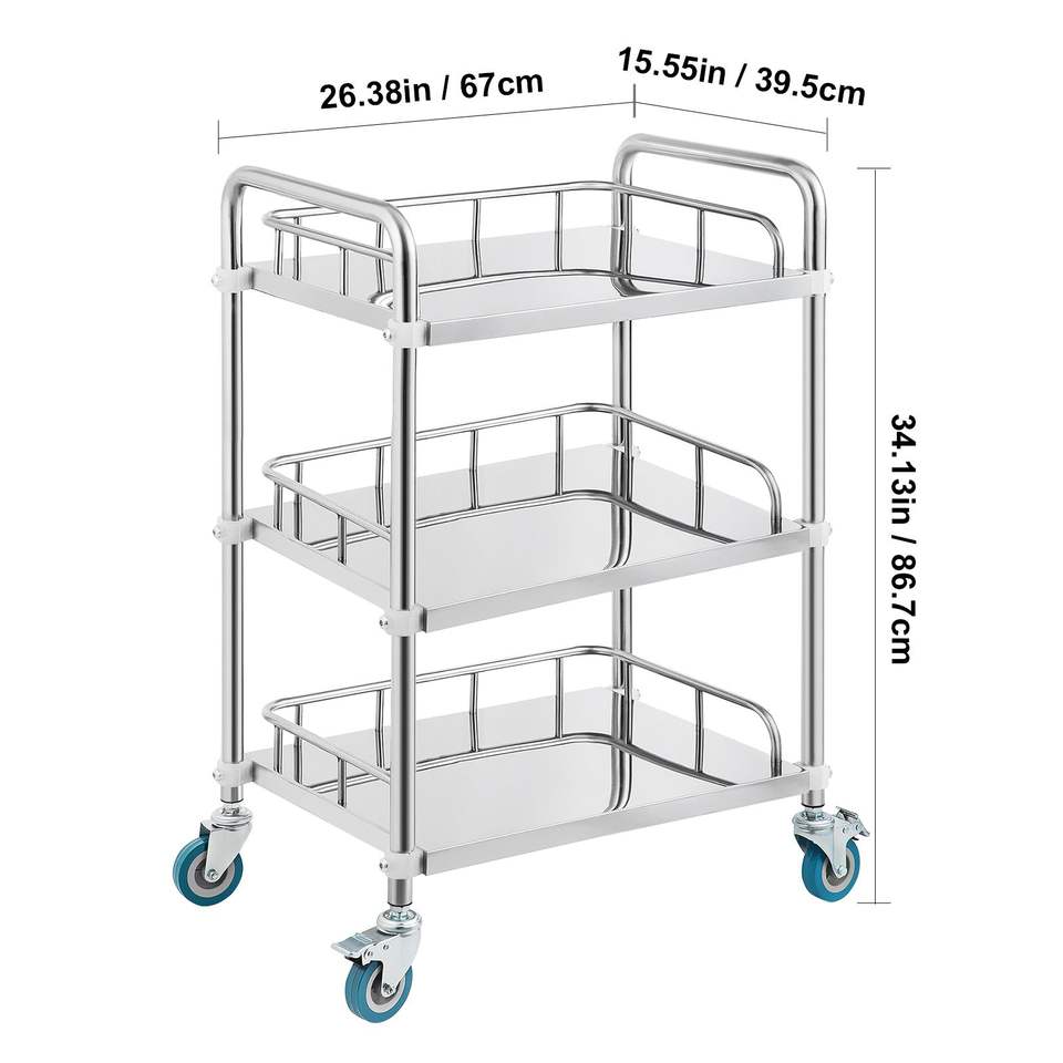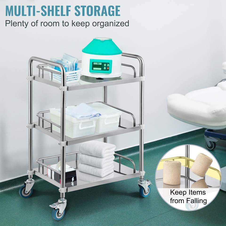 Chariot de service de laboratoire à 3 étagères en acier inoxydable avec roulettes pivotantes, chariot utilitaire dentaire pour clinique, chariot roulant avec roues pour service de laboratoire