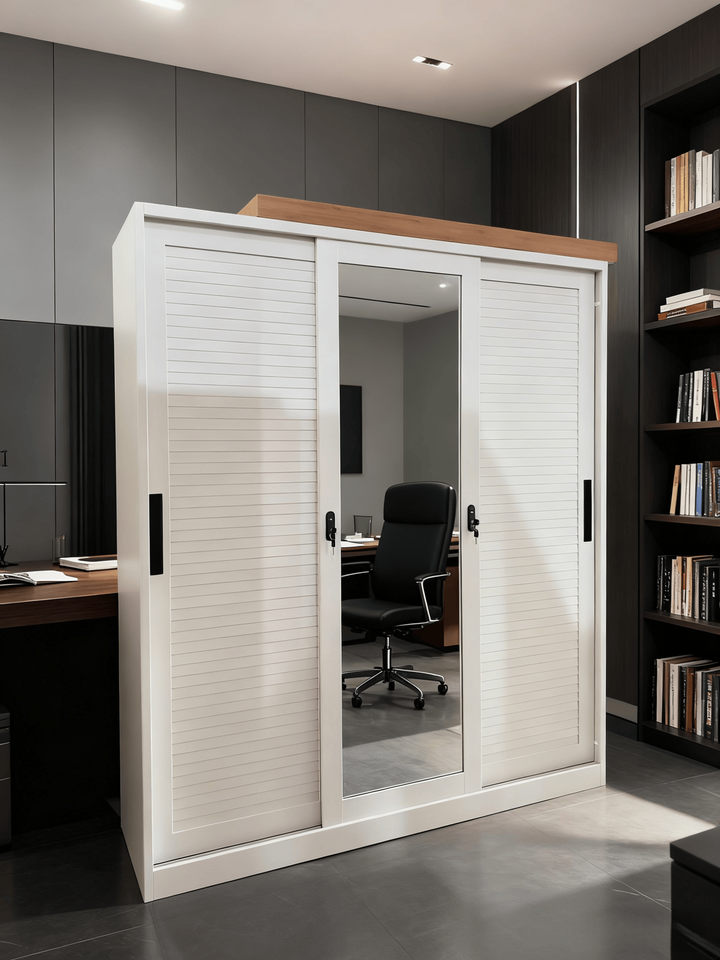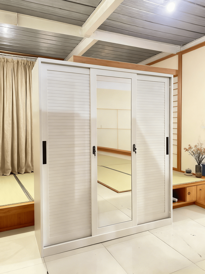 Armoire en acier à 3 portes coulissantes à persiennes, motif imprimé, avec miroir pour chambre à coucher