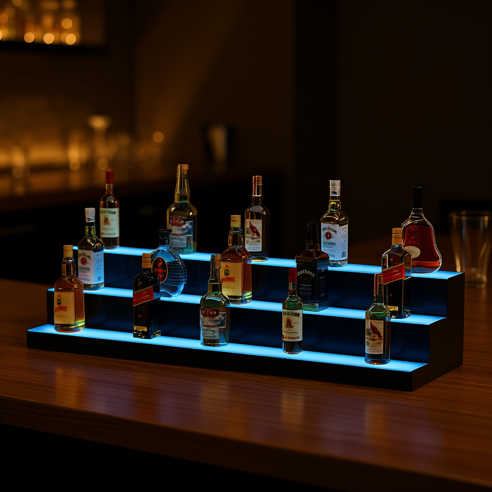 Étagère de bar à 3 niveaux avec éclairage LED pour bouteilles d'alcool, 48 pouces, en acrylique, à fixation murale, mobilier de bar contemporain
