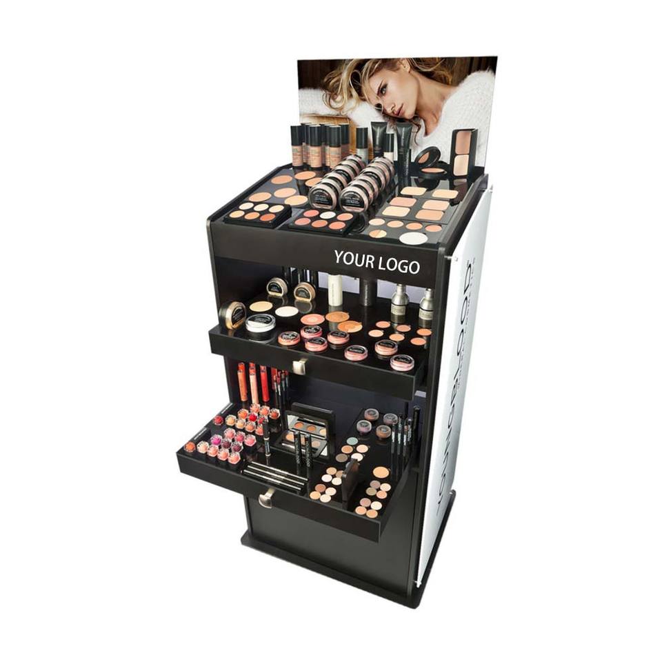 Étagère à cosmétiques à 3 niveaux, présentoir autoportant pour produits de soin de la peau, palette de fards à paupières, vitrine de maquillage avec tiroir