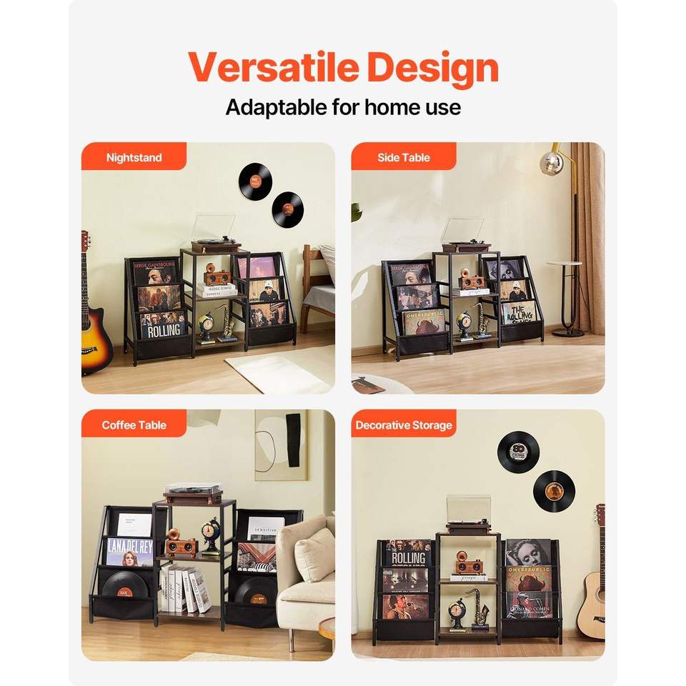 Support de tourne-disque en métal à 3 niveaux avec porte-disques en bois et bacs en tissu, étagère de présentation pour tourne-disque