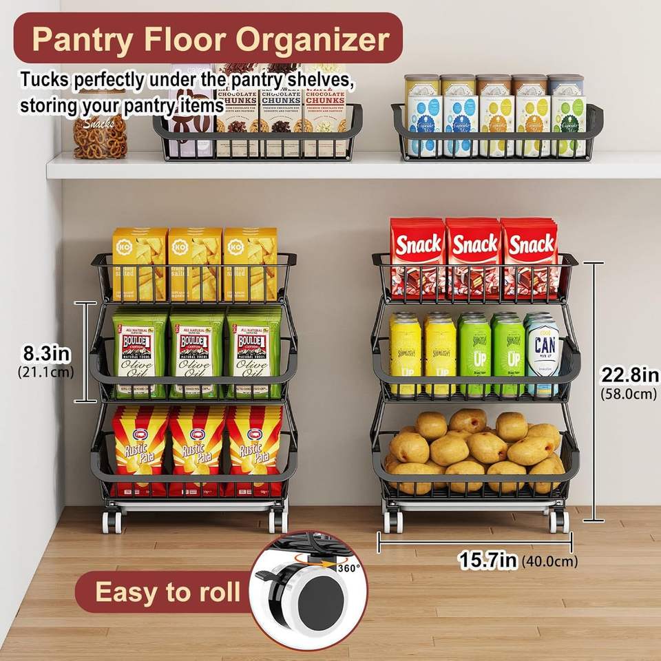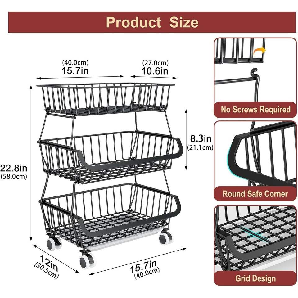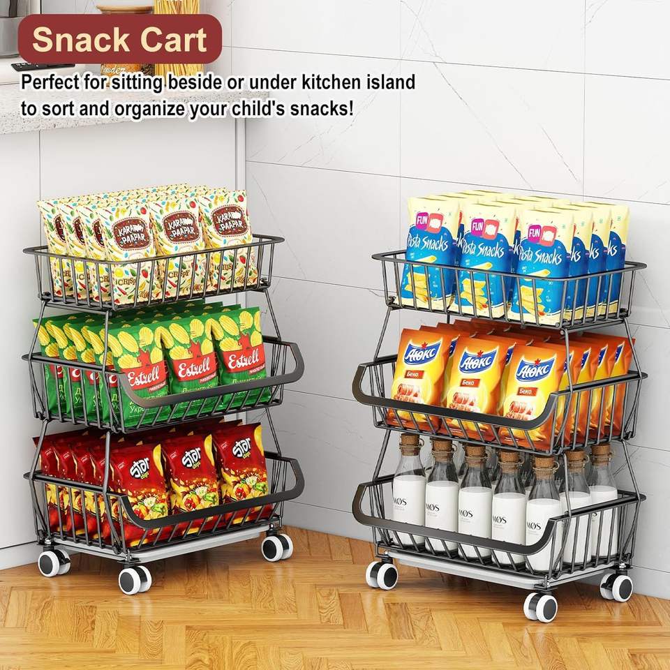 Chariot de rangement à 3 niveaux sur roulettes, empilable, en fil métallique, pour cuisine, étagères à collations, panier à fruits