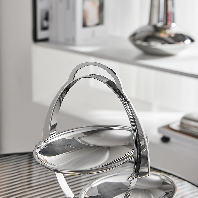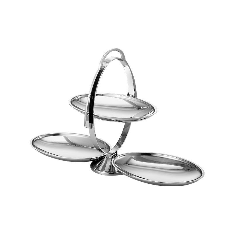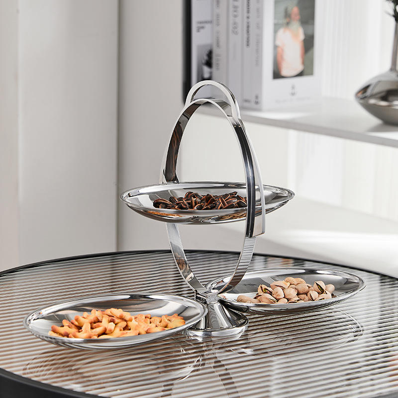 Plateau à collations à 3 niveaux en acier inoxydable avec poignée - Plateau de service argenté poli pour noix, apéritifs et présentation sur table de fête